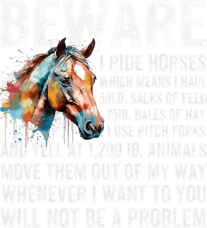 See allThis unique DTF transfer features a stunning watercolor-style horse head paired with the bold, humorous statement: "BEWARE I RIDE HORSES WHICH MEANS I HAUL 50LB. SACKS OF FEED 75IB. BALES OF HAY I USE PITCH FORKS AND YELL AT 1,200 IB. ANIMALS MOVE THEM OUT OF MY WAY WHENEVER I WANT TO YOU WILL NOT BE A PROBLEM." This ready to press design perfectly captures the strength and humor of equestrian life, blending vibrant artistry with a powerful message for horse enthusiasts. Ideal for dedicated equestrians, ranch hands, horse trainers, or anyone who lives and breathes the stable life. This heat press design makes a fantastic gift for birthdays, Mother's Day, Christmas, or just to show off your passion at horse shows, rodeos, or casual outings. It's a perfect conversation starter for anyone who understands the realities of caring for horses. Applying this vibrant heat transfer is simple with a standard heat press or even a household iron. It adheres beautifully to a wide range of fabrics, including 100% cotton, polyester, and various blends. For best results, press at 300-325°F for 15 seconds with medium pressure. Enjoy the convenience of a ready to press transfer with no tedious weeding required, making custom apparel creation quick and easy. Crafted using professional-grade DTF film and high-quality inks, this iron on transfer ensures vivid colors that pop and a soft, flexible feel that won't crack or peel. Each t-shirt transfer is designed for maximum durability, standing up to countless washes while maintaining its rich detail and strong adhesive. Elevate your garments with a professional-looking finish that lasts.