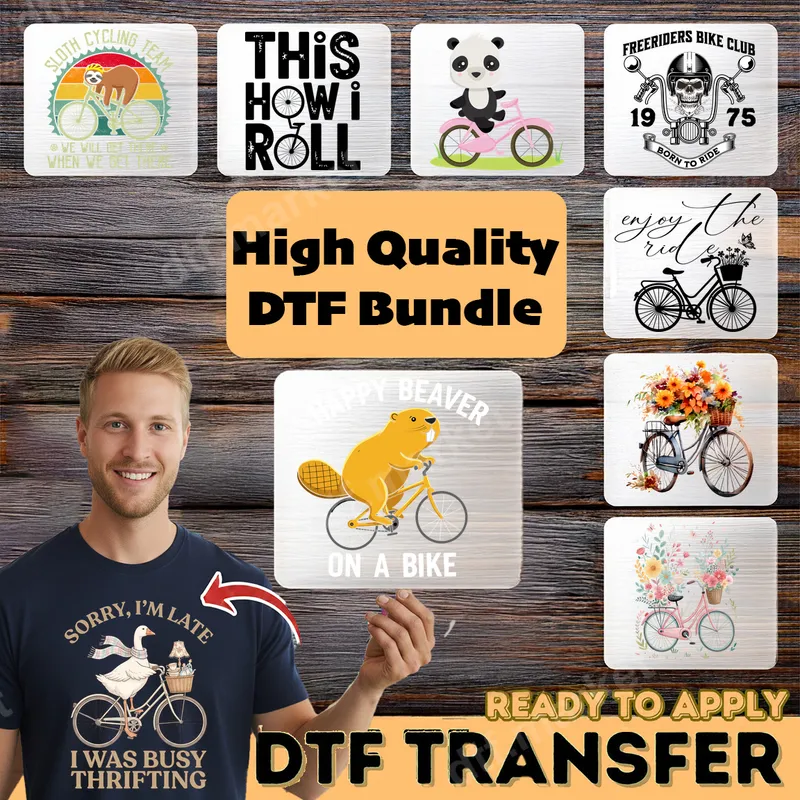 See allDiscover our versatile DTF transfer bundle, a collection of 8 unique designs perfect for cycling enthusiasts and animal lovers alike. This ready to press assortment features adorable animals on bikes like a charming panda, a 'happy beaver,' and a whimsical 'Sloth Cycling Team.' You'll also find elegant floral bicycle motifs and witty typographic designs such as 'This Is How I Roll.' Each high-quality DTF transfer is crafted to bring vibrant life to your garments. This diverse heat transfer collection is ideal for personalizing t-shirts, hoodies, and tote bags for cyclists, nature lovers, or anyone with a playful sense of humor. Perfect for casual wear, bike club events, gifting to friends and family, or creating unique merchandise. Whether you're a slow rider or a speed demon, these designs offer something special for every biking enthusiast. They make fantastic gifts for birthdays, holidays, or just because! Applying these vibrant designs is straightforward. Each heat press transfer works flawlessly on a wide range of materials, including cotton, polyester, and various fabric blends. For best results, use a heat press at 300-325°F for 15 seconds with medium pressure, then perform a cool peel. Alternatively, these iron on transfers can be applied with a household iron (firm pressure, no steam). Enjoy the convenience of a ready to press design with no tedious weeding required. Experience premium quality with every apparel transfer from our collection. Our DTF prints boast exceptional color vibrancy, intricate detail, and remarkable durability. Designed to resist cracking and fading, these transfers maintain their pristine appearance wash after wash. The film is soft to the touch, ensuring maximum comfort on your finished garment. Elevate your wardrobe or create custom gifts with professional-grade heat press designs that last.