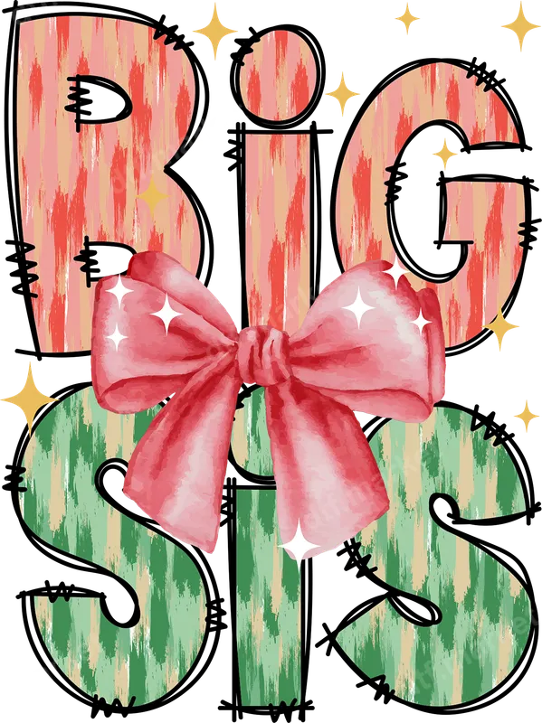 See allThis delightful 'BIG SIS' DTF transfer features charming distressed brushstroke lettering in pink, orange, green, and beige hues. A beautiful watercolor-style pink bow with sparkling stars sits front and center, giving the design a sweet, celebratory vibe. This high-quality direct to film transfer is ready to press onto your chosen garment, making custom apparel creation simple and fun for any proud big sister. Ideal for expecting families announcing a new arrival, baby showers, or as a thoughtful gift for an older sibling. This versatile heat transfer design is perfect for creating matching shirts, custom outfits for family photos, or simply to celebrate her important role. Designed for toddlers and young girls, this transfer lovingly highlights the joy of being a big sister. Our premium heat press transfer works flawlessly on cotton, polyester, and various blends. For best results, apply with a heat press at 300-325°F for 15 seconds with medium pressure. It can also be applied with a household iron. These iron on transfers require no weeding, cutting, or layering, saving you significant time and effort in your crafting projects. Experience superior quality with our professionally printed DTF transfers. Each design boasts incredibly vibrant colors, exceptional detail, and a soft-to-the-touch finish. Crafted from durable direct to film transfer film with strong adhesive, these apparel transfers are crack-resistant and built to withstand countless washes. Your custom shirt design will truly look fantastic for years to come.