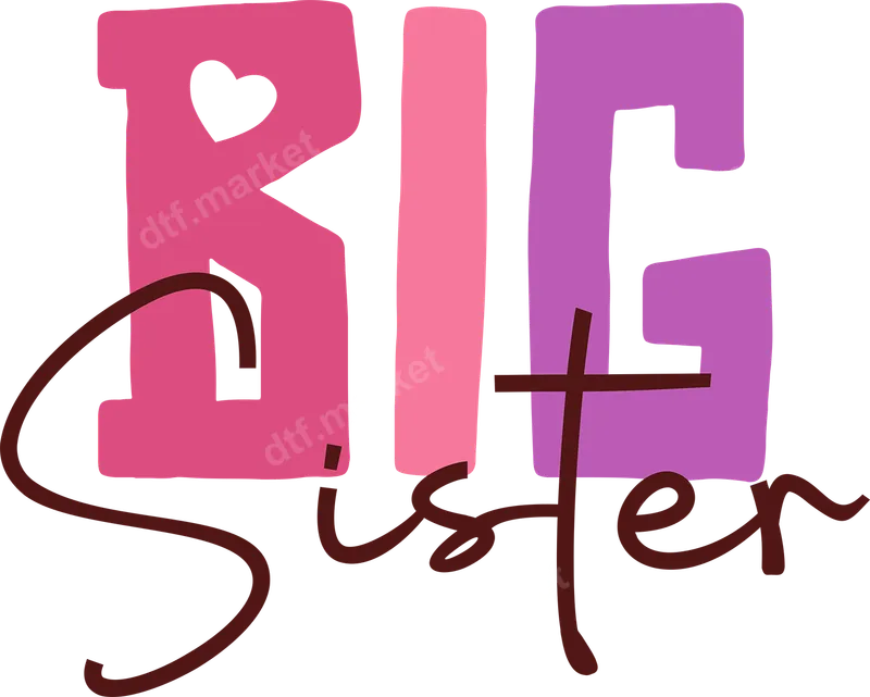 See allOur charming 'BIG Sister' DTF transfer features playful pink and purple block lettering for 'BIG' with a sweet heart cutout in the 'B', complemented by an elegant brown script for 'Sister'. This ready to press design exudes warmth and sibling affection, making it a perfect statement piece. It's an instant way to celebrate the joy of becoming or being a big sister with a vibrant heat press transfer that truly pops. This adorable iron on transfer is ideal for expectant families announcing a new arrival, baby shower gifts, or simply celebrating a proud older sister. It's a thoughtful present for birthdays, holidays, or any day you want to recognize the special role of a big sister. Create custom t-shirts, onesies, or tote bags for siblings to wear together, making cherished memories and photo opportunities. Applying your big sister apparel transfer is incredibly simple. Our premium DTF transfers work seamlessly on a wide variety of materials, including cotton, polyester, and various fabric blends. Achieve professional results using a heat press set between 300-325°F for 15 seconds with medium, even pressure. Unlike traditional vinyl transfer methods, there's absolutely no weeding required, saving you time and effort. Experience superior quality with our durable direct to film transfer. Each design boasts vibrant, true-to-color inks that resist cracking, peeling, and fading, ensuring your customized garment looks fantastic wash after wash. The finished graphic is soft to the touch, flexible, and seamlessly integrates with the fabric. Trust dtf.market for heat press ready designs that deliver professional results every time.