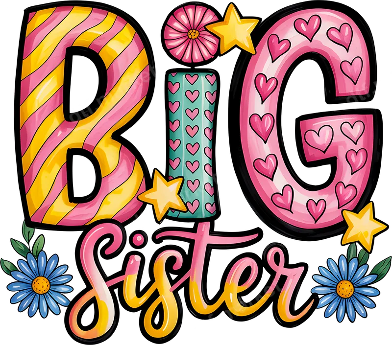 See allThe "BIG Sister" DTF transfer showcases a vibrant and playful design, perfect for celebrating a new addition to the family. Featuring bold, colorful lettering with charming details like hearts, stars, and cheerful flowers, this ready to press design exudes joy and excitement. The "BIG" is rendered in a delightful mix of striped and heart-filled patterns, while "Sister" flows in a sweet script, making it an irresistible apparel transfer for any proud older sibling. This cheerful heat transfer is ideal for expectant parents looking to announce a pregnancy or reveal a new sibling in style. It makes a fantastic gift for a future big sister to wear at baby showers, gender reveal parties, or family gatherings. Imagine the adorable photos with your little one proudly sporting this iron on transfer on their favorite shirt, ready to embrace their new role. It's also perfect for capturing memorable moments with family portraits. Our premium DTF transfers are incredibly versatile and easy to apply to a wide range of materials, including 100% cotton, polyester, and various fabric blends. For best results, use a heat press at 300-325°F for 15 seconds with medium pressure, then cold peel the film. While a heat press is recommended for professional results, this high-quality heat press design can also be applied with a household iron, offering convenience without the hassle of weeding like traditional vinyl transfer. Experience superior durability and a professional finish with our direct to film transfers. Each design is printed with vibrant, long-lasting inks that resist cracking, peeling, and fading, ensuring your garment looks great wash after wash. The specialized DTF film ensures a soft, smooth feel on the fabric, providing comfort for kids and adults alike. Our ready to press transfers are engineered for strong adhesion and brilliant color reproduction, making your personalized creations stand out.