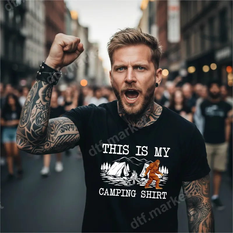 See allShow off your love for the wilderness and legendary cryptids with this awesome "THIS IS MY CAMPING SHIRT" DTF transfer. Featuring a classic Bigfoot silhouette strolling past a cozy campsite complete with tents, a roaring campfire, and distant mountains, this design perfectly captures the spirit of outdoor adventure with a humorous twist. It's a high-quality, ready to press transfer that brings a unique touch to any garment. This Bigfoot camping heat transfer is ideal for anyone who loves hiking, camping, or just appreciates a good laugh. Perfect for men, women, and even kids heading out on their next family vacation, scout trip, or casual outdoor gathering. It makes an excellent gift for Father's Day, birthdays, or as a fun surprise for the outdoorsy person in your life who believes Bigfoot is out there. Applying this durable DTF transfer is simple with either a professional heat press or a household iron. It adheres beautifully to cotton, polyester, and most fabric blends, making it a versatile iron on decal for a wide range of apparel. Forget the hassle of weeding vinyl – this heat press design is ready to be applied instantly, transforming blank shirts into personalized masterpieces. Experience superior quality with our professional-grade DTF film. This apparel transfer boasts vibrant, crisp colors that resist cracking and fading, ensuring your design looks fantastic wear after wear. The soft-touch finish means the design integrates smoothly with the fabric, providing comfortable wear that lasts through countless adventures and washes.