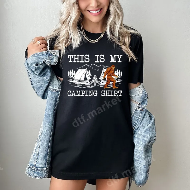 See allThis unique DTF transfer features a playful depiction of Bigfoot enjoying a campsite, complete with a tent, roaring campfire, and majestic mountains in the background. The bold text "THIS IS MY CAMPING SHIRT" adds a humorous touch, making it the perfect statement piece for any outdoor enthusiast. This high-quality, ready to press transfer brings a touch of wilderness mystique and fun to your apparel projects. Ideal for campers, hikers, Bigfoot enthusiasts, and anyone who loves a good laugh in the great outdoors. This versatile heat transfer makes an excellent gift for birthdays, Father's Day, camping trips, or simply to celebrate a love for nature and cryptids. It’s perfect for creating matching shirts for your next family camping adventure or a quirky design for a friend who believes. Our premium direct to film transfers are designed for effortless application on a wide range of fabrics, including cotton, polyester, and various blends. Achieve professional results using a heat press set between 300-325°F for 15 seconds with medium pressure, followed by a warm peel. For convenience, a household iron can also be used. Best of all, there's no weeding or layering required, making your custom projects simple and quick. Experience vibrant colors and crisp details with every iron on transfer. Our designs are printed on durable DTF film, ensuring a soft feel that resists cracking and peeling, even after multiple washes. The strong adhesive provides long-lasting wear, giving your custom t-shirt transfer a professional finish that stands the test of time. Create durable and eye-catching apparel with ease.