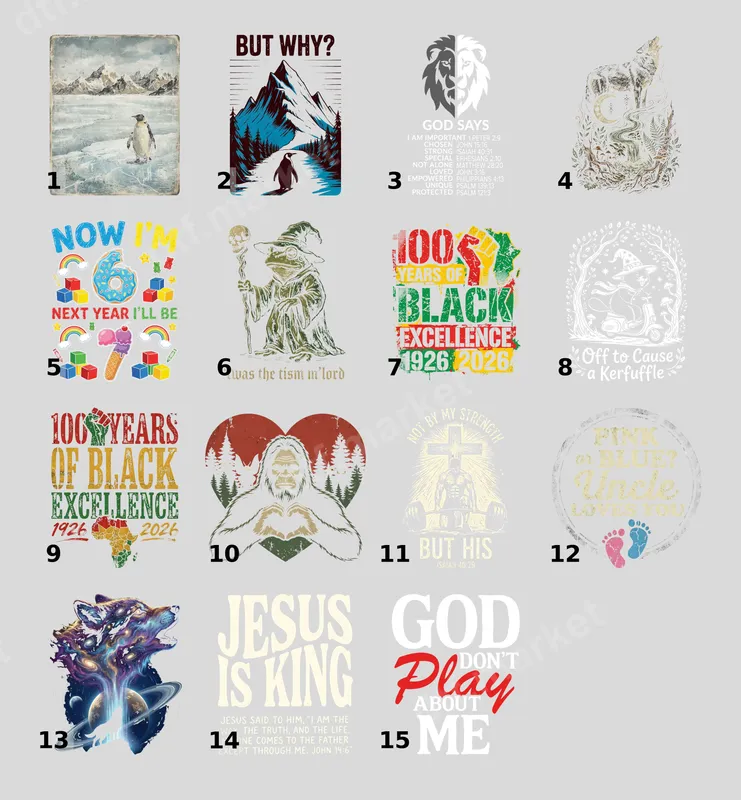 Premium DTF transfer designs for every occasion. From streetwear to faith-inspired art, we create heat press ready designs that make your garments stand out.