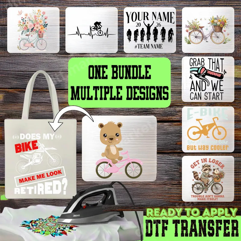 See allThis versatile Bike & Cycling DTF Transfer Bundle offers a fantastic collection of designs for every bike enthusiast. From the whimsical charm of a floral vintage bicycle and a cute bear on a pink bike to the adrenaline of a dirt bike and team cycling graphics, this bundle has it all. You'll find humorous sayings like "Does my bike make me look retired?" and "Get in loser" alongside cool e-bike designs and a dynamic biker heartbeat motif. Each design is a high-quality, ready to press DTF transfer, perfect for adding personality to your wardrobe. This diverse direct to film transfer bundle is ideal for cyclists of all ages and styles – from road bikers and mountain bikers to e-bike riders, dirt bike enthusiasts, and casual cruisers. It's perfect for personalizing gear for bike clubs, family cycling events, or simply expressing your love for two-wheeled adventures. These heat press transfers make excellent gifts for birthdays, Father's Day, Mother's Day, or as fun additions to a cycling trip wardrobe. Create custom apparel for friends, family, or even for your small business. Applying these heat press designs is a breeze! Each iron on transfer is compatible with a wide range of fabrics, including cotton, polyester, and various blends. For best results, use a heat press at 300-325°F for 15 seconds with medium pressure. If you don't have a heat press, a household iron can also be used following careful instructions. Enjoy the convenience of a ready to press transfer with no tedious weeding, peeling, or layering required – just press and go! Experience superior quality with our professional-grade DTF transfers. Printed on premium direct to film transfer film, these designs boast vibrant colors, crisp details, and exceptional durability. They are crack-resistant, peel-resistant, and feature a soft-to-the-touch finish that blends seamlessly with your garment. Our apparel transfers ensure long-lasting wear and a professional look on every t-shirt, hoodie, or bag. Elevate your custom creations with these reliable and stunning t-shirt transfers.