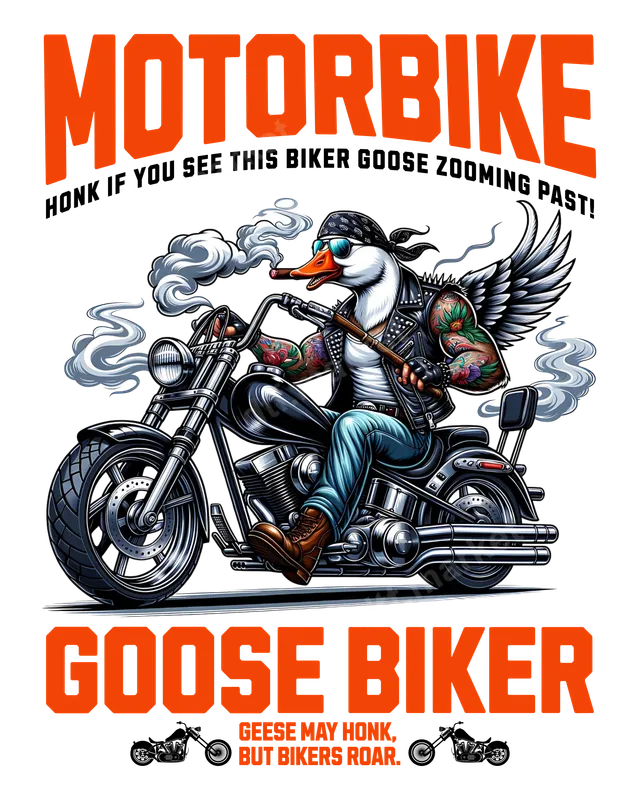 See allThis unique DTF transfer features a badass biker goose, complete with a leather jacket, bandana, sunglasses, and impressive tattoos, cruising confidently on a classic motorcycle while puffing on a cigar. The design captures a rebellious spirit with a humorous twist, declaring "HONK IF YOU SEE THIS BIKER GOOSE ZOOMING PAST!" and "GEESE MAY HONK, BUT BIKERS ROAR." It's a high-quality, ready to press transfer that brings a bold, edgy, and funny vibe to any garment. Perfect for motorcycle riders, animal lovers with a sense of humor, or anyone who appreciates quirky, eye-catching apparel. This design makes an excellent gift for birthdays, Fathers Day, or just to surprise a friend who enjoys a good laugh and biker culture. It's ideal for casual wear, biker rallies, or adding personality to your everyday wardrobe. This ready to press transfer lets you express your unique style effortlessly. Our direct to film transfers are incredibly versatile, adhering beautifully to cotton, polyester, and various fabric blends. Applying this heat transfer is simple with either a professional heat press (recommended 300-325°F for 15 seconds with medium pressure) or even a household iron. Unlike traditional vinyl transfer, there's no weeding or complex layering involved – just press and peel for a perfect finish every time. Crafted with professional-grade DTF film, this t-shirt transfer ensures stunningly vibrant colors and exceptional durability. The advanced ink technology results in a crack-resistant image that feels soft to the touch, not stiff or heavy. Enjoy a long-lasting, high-definition design that stands up to countless washes, maintaining its quality and detail on your favorite shirts and accessories. This premium apparel transfer offers a professional look with DIY ease.