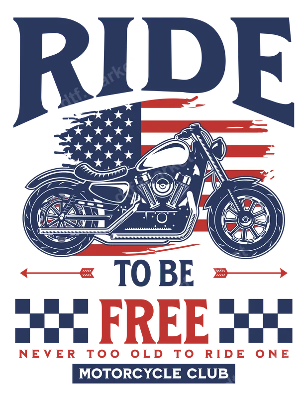 See allThis striking DTF transfer features a classic motorcycle silhouetted against a distressed American flag backdrop. Bold text declares "RIDE TO BE FREE" and "NEVER TOO OLD TO RIDE ONE MOTORCYCLE CLUB," encapsulating the spirit of the open road and American freedom. This ready to press design is perfect for customizing apparel for bikers and patriots alike. Ideal for motorcycle enthusiasts, veteran riders, and anyone who cherishes American values and the thrill of the ride. This heat press transfer makes a fantastic gift for Father's Day, Memorial Day, or birthdays, and is perfect for customizing gear for motorcycle rallies, club events, or casual everyday wear. Applying this iron on transfer is simple. It works seamlessly on a wide range of fabrics, including cotton, polyester, and their blends. For best results, use a heat press at 300-325°F for 15 seconds with medium pressure. Even a household iron can achieve great results. No weeding, no mess – just press and peel for a professional finish. Crafted with professional-grade DTF film and strong adhesive, this apparel transfer delivers vibrant, crack-resistant colors and a soft-to-touch feel. You'll get a durable, high-quality t-shirt transfer that stands up to washes and wear, ensuring your custom garments look great for years to come.
