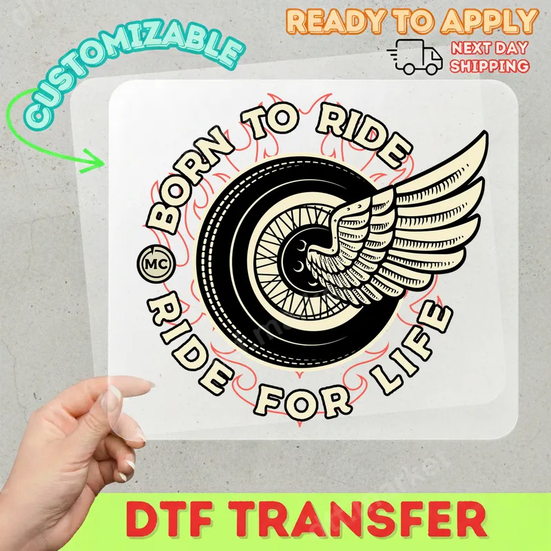 See allThis striking direct to film transfer features a classic motorcycle wheel adorned with powerful wings, encircled by the iconic phrase "BORN TO RIDE RIDE FOR LIFE" in bold, flame-edged lettering, complete with an "MC" emblem. The design evokes the spirit of freedom, adventure, and camaraderie of motorcycle culture, making it a perfect ready to press statement piece. This heat press design is tailor-made for motorcycle riders, club members, vintage enthusiasts, and anyone who lives for the open road. It's an excellent choice for biker rallies, club events, road trips, or as a unique gift for a dad, brother, or friend who loves their hog. Easily create custom apparel for everyday wear or special riding occasions. Applying this high-quality iron on transfer is straightforward. It adheres beautifully to a wide range of fabrics including cotton, polyester, and their blends. For best results, use a heat press at 300-325°F for 15 seconds with medium pressure, then cold peel. A household iron can also be used with firm, even pressure. No tedious weeding is required, saving you time and effort. Our DTF transfers are crafted using premium film and ink, ensuring vibrant colors and exceptional durability. The print is crack-resistant, peel-resistant, and boasts a soft, lightweight feel that integrates seamlessly with the fabric. Enjoy professional-grade results that withstand countless washes, keeping your custom t-shirt transfer looking fresh ride after ride.