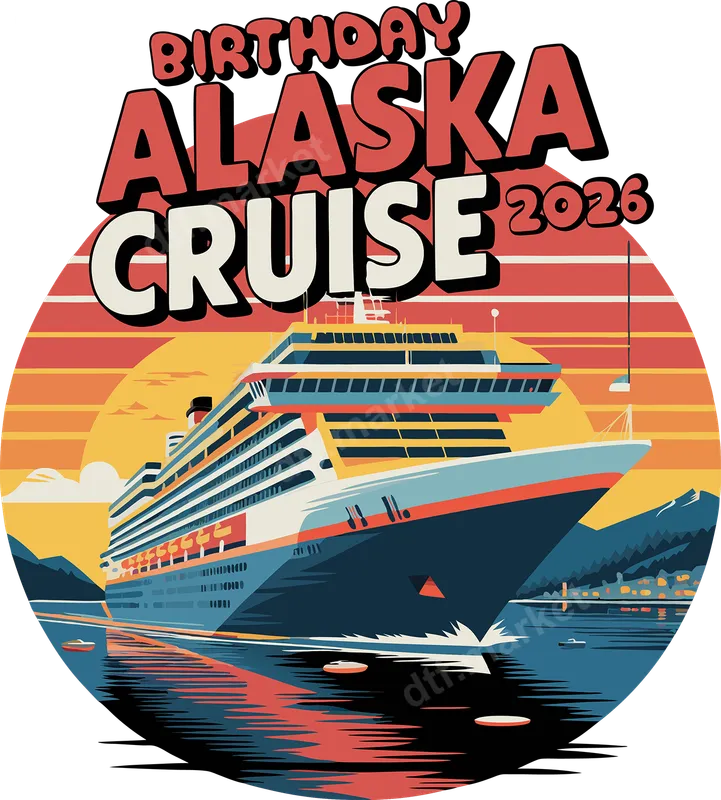 See allThis eye-catching DTF transfer captures the spirit of adventure with a bold, retro-inspired cruise ship navigating serene waters against a striking sunset backdrop. Featuring the text "BIRTHDAY ALASKA CRUISE 2026" in fun, bubbly lettering, this design is a fantastic ready to press graphic that evokes excitement for an unforgettable journey. The vibrant colors and clean lines make it a stylish choice for any cruise enthusiast. Perfect for families, friends, or couples celebrating a special birthday with a grand Alaska cruise in 2026, this heat transfer is ideal for creating matching shirts for your travel group. Whether it’s a milestone birthday, a family reunion vacation, or just a fun group getaway, this unique design makes a great keepsake or gift for all participants. Outfit your whole crew with personalized apparel that commemorates your epic adventure before you even set sail. Applying this direct to film transfer is incredibly easy, making it perfect for both personal use and small businesses. It works seamlessly on a wide variety of fabrics, including cotton, polyester, and their blends. Simply use a heat press at 300-325°F for 15 seconds with medium pressure, or apply with a household iron. There's no tedious weeding required, so you can achieve professional results quickly and efficiently. Our high-quality t-shirt transfer ensures a vibrant, durable finish that is crack-resistant and soft to the touch. Printed on professional DTF film with strong adhesive, this apparel transfer is designed to withstand countless washes while maintaining its rich colors and intricate details. Create lasting memories with custom garments that celebrate your special Alaska cruise.