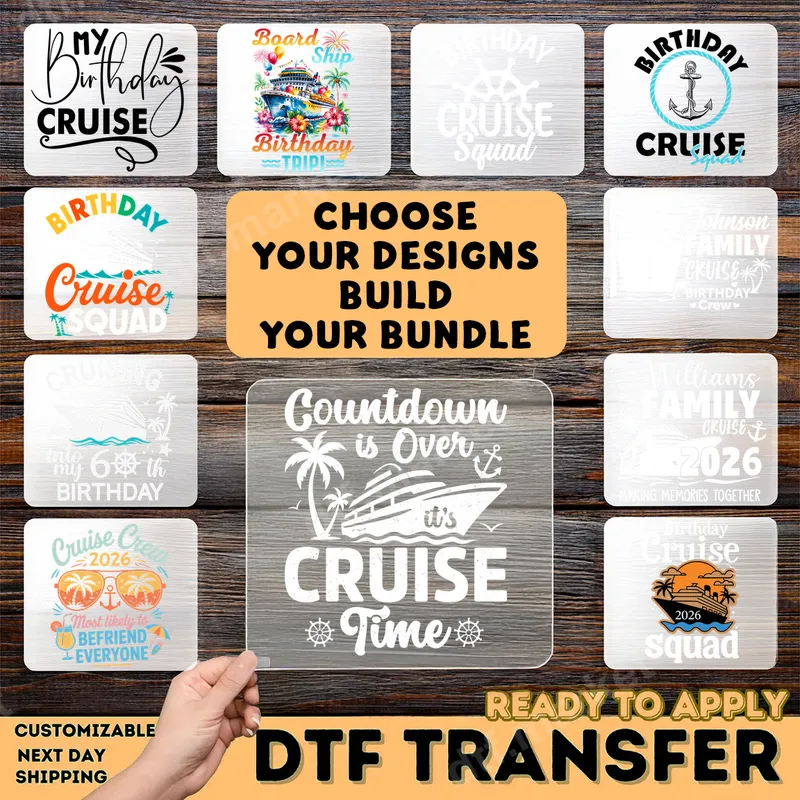 See allSet sail for celebration with our vibrant Birthday Cruise DTF transfer collection. This ready to press bundle features a variety of festive designs perfect for commemorating your special voyage, whether it's 'My Birthday Cruise,' a 'Cruise Squad' adventure, or a 'Family Cruise' vacation. Each direct to film transfer captures the excitement of the open sea with elements like ships, anchors, palm trees, and tropical accents, ensuring your custom apparel is as memorable as your trip itself. Get ready to add personalized flair to your journey. These versatile cruise heat transfers are ideal for anyone celebrating a birthday at sea, planning a family reunion cruise, or embarking on a group trip with friends. Perfect for creating matching shirts for your 'Cruise Crew,' celebrating a milestone like a 60th birthday, or simply making memories together on your next vacation. They also make fantastic personalized gifts for fellow travelers or thoughtful mementos for your own journey, ensuring everyone looks unified and stylish on deck or ashore. Applying your DTF transfer is effortless! These high-quality iron on transfers adhere beautifully to almost any fabric, including cotton, polyester, and various blends. For best results, use a heat press at 300-325°F for 15 seconds with medium pressure, then cold peel the film. A household iron can also be used for application. Enjoy a professional finish without the hassle of weeding or layering, making custom apparel creation quick and enjoyable for everyone, even beginners. Our DTF transfers are crafted using premium professional direct to film technology, ensuring vibrant colors that pop and crisp details that last. The durable heat press design is crack-resistant, peel-resistant, and surprisingly soft to the touch, providing superior comfort compared to traditional vinyl transfers. With strong adhesive properties, your apparel transfer will withstand countless washes, maintaining its stunning appearance and keeping your cruise memories alive long after you've returned to shore.