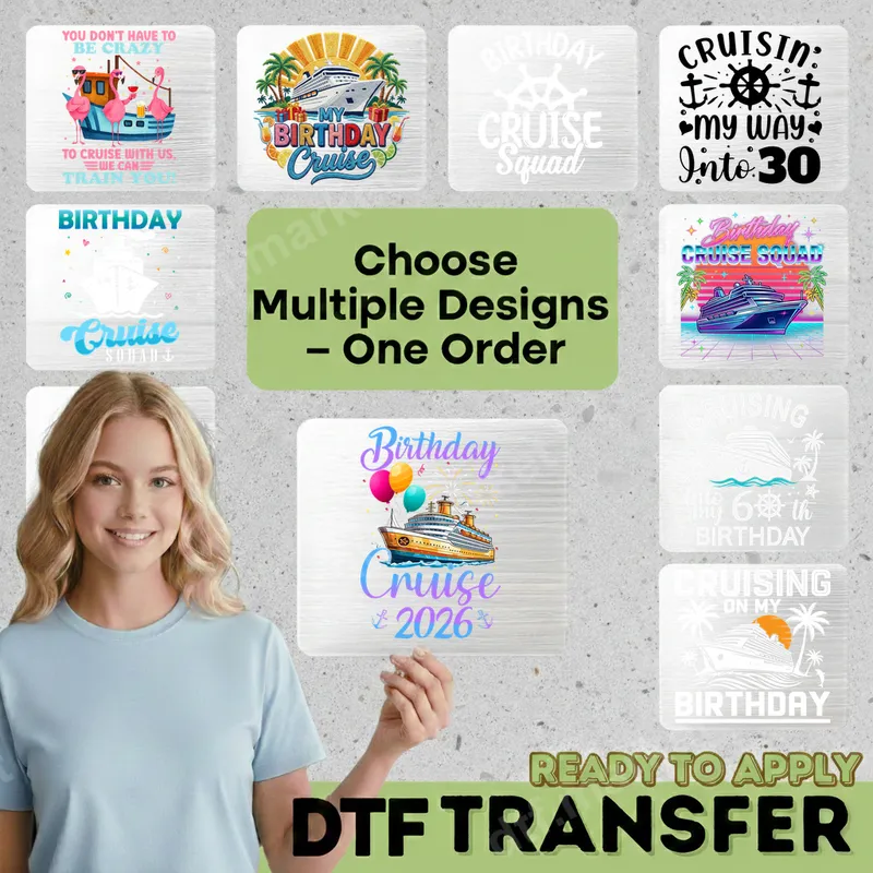 See allSet sail for a memorable celebration with our diverse collection of Birthday Cruise DTF Transfers! This listing offers a variety of vibrant designs featuring festive cruise ships, tropical elements like palm trees and flamingos, and fun typography perfect for commemorating your special day at sea. From bold "My Birthday Cruise" graphics to "Cruise Squad" themes for groups, each direct to film transfer is ready to press onto your chosen apparel, ensuring a lively and personalized look for your birthday voyage. These versatile designs are ideal for anyone planning a birthday celebration aboard a cruise ship, whether it's for a milestone like a 30th or 60th birthday, or simply a fun family vacation. Perfect for individuals, couples, or entire cruise squads, these heat press designs make fantastic personalized gifts or matching outfits for your group. Create custom t-shirts, tank tops, or even tote bags to wear on deck, at excursions, or during dinner, ensuring everyone knows it's a special occasion. Applying these high-quality heat transfers is straightforward, making customization accessible for everyone. Our DTF transfers work beautifully on a wide range of fabrics, including cotton, polyester, and various blends. For best results, use a heat press at 300-325°F for 15 seconds with medium pressure. Even if you don't have a heat press, a household iron can be used by following specific instructions. Enjoy the convenience of no weeding or masking required – just press and peel! Experience superior print quality with our professional-grade DTF film. Each apparel transfer boasts vibrant colors, crisp details, and excellent durability that stands up to washing without cracking or fading. The designs are soft to the touch, seamlessly integrating with the fabric for a comfortable wear. With strong adhesive properties, your ready to press transfer will securely bond to your garment, ensuring your custom birthday cruise attire lasts long after the vacation ends.