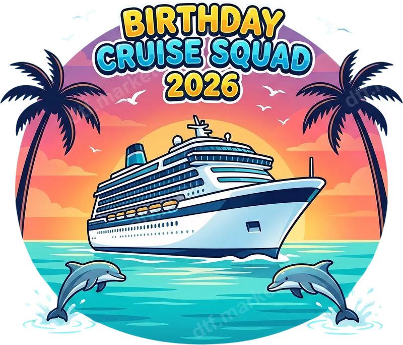 See allGet ready to set sail for an unforgettable celebration with our vibrant 'Birthday Cruise Squad 2026' DTF transfer! This eye-catching design captures the excitement of a tropical vacation, featuring a majestic cruise ship gliding across sparkling turquoise waters, flanked by playful dolphins. Lush palm trees silhouette against a breathtaking sunset, creating a perfect backdrop. The bold, celebratory text makes this a prime ready to press transfer for group adventures. This unique design is ideal for anyone planning a special birthday cruise in 2026, whether with friends, family, or as a couple. Create matching t-shirts for your entire 'Birthday Cruise Squad' to wear on board, during shore excursions, or for memorable group photos. It's also a fantastic gift idea or a fun way to announce an upcoming trip. Imagine custom beach bags or hats for everyone in your party! Applying this direct to film transfer is effortless! It works beautifully on cotton, polyester, and blends, making it perfect for custom t-shirts, hoodies, tote bags, and more. Simply use a heat press at 300-325°F for 15 seconds with medium pressure. For those without a professional press, a household iron can also create your perfect iron on apparel. No weeding or complex layering involved – just press and peel your custom transfer! Experience superior quality with our DTF heat press transfers. Each design is printed with vibrant, long-lasting colors that resist cracking and fading, ensuring your custom garments look fantastic. The transfers boast a soft, lightweight feel, blending seamlessly with the fabric. Crafted using professional DTF film and strong adhesive, you're guaranteed a durable and high-quality shirt design that's ready to impress.