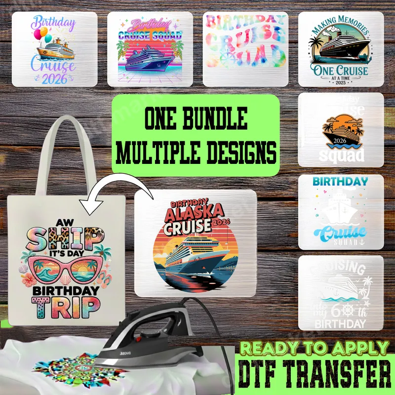 See allSet sail in style with this fantastic Birthday Cruise Squad DTF transfer bundle, perfect for celebrating your special day on the high seas! Featuring an array of vibrant and fun designs like "Aw Ship It's Day Birthday Trip," "Birthday Alaska Cruise," and classic "Birthday Cruise Squad" motifs, this collection is your ultimate ready to press solution for group apparel. Each design captures the excitement of a cruise celebration, from tropical sunsets with palm trees to elegant cruise ships, ensuring you and your crew stand out. This versatile t-shirt transfer bundle is ideal for anyone planning a birthday cruise, group vacation, or milestone celebration. Whether you're cruising into your 60th birthday, embarking on an Alaskan adventure, or simply making memories one cruise at a time, these designs are perfect for friends, family, and fellow travelers. They make fantastic personalized gifts for the entire cruise squad or unique souvenirs to remember an unforgettable trip. Applying these high-quality heat transfer designs is incredibly easy. Simply use a heat press at 300-325°F for 15 seconds with medium pressure, or even a household iron for smaller applications. Our iron on transfers adhere beautifully to various fabrics, including cotton, polyester, and blends. Forget the hassle of weeding or layering vinyl transfer, these come pre-printed and ready to be pressed onto your chosen garment. Experience professional-grade results with our durable DTF transfers. Each design boasts vibrant colors, excellent wash durability, and a soft, smooth finish that won't crack or peel. Crafted from professional DTF film with a strong adhesive, these heat press ready designs ensure your custom apparel looks fantastic and lasts for many cruises to come, turning every shirt into a wearable memory.
