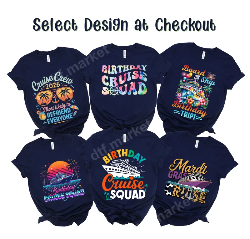See allThis listing offers a vibrant selection of DTF transfer designs perfect for your next cruise adventure. Choose from various themes including "Birthday Cruise Squad," "Cruise Crew," and even a festive "Mardi Gras Cruise" option. Each ready to press design features lively graphics like tropical scenes, celebratory ships, retro sunsets, and fun typography, ensuring you find the perfect heat press design to match your trip's vibe. Ideal for cruise enthusiasts, birthday celebrants, and groups heading out on family vacations or special trips. These unique t-shirt transfers are perfect for creating matching apparel for birthday cruises, bachelorette parties, family reunions at sea, or festive Mardi Gras celebrations. They also make fantastic personalized gifts for fellow travelers or memorable souvenirs of your journey. Applying these high-quality designs is incredibly easy. Each iron on transfer is designed to work seamlessly with a heat press, typically at 300-325°F for 15 seconds with medium pressure, or can be applied using a household iron for smaller projects. No tedious weeding is required, making customization quick and hassle-free on various fabrics like cotton, polyester, and blends. Our professional-grade DTF transfers boast vibrant colors that truly pop, offering exceptional durability and resistance to cracking and fading. The soft-touch finish integrates smoothly with your garment, providing a comfortable feel. Crafted with strong adhesive on premium DTF film, these designs ensure a long-lasting, professional look for all your custom apparel.