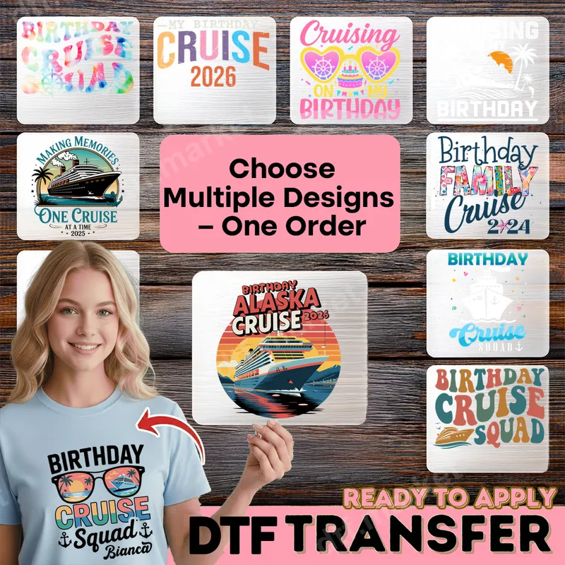 See allThese charming designs are perfect for celebrating a special birthday cruise. Featuring festive typography, cheerful cruise ships, and tropical elements like sunglasses and anchors, these vibrant DTF transfers capture the excitement of a sea-faring celebration. Whether it's a "Birthday Cruise Squad" adventure or "My Birthday Cruise 2026," each ready to press transfer brings a fun, celebratory vibe to any garment. Ideal for anyone planning a birthday celebration on the high seas, these apparel transfers are perfect for family cruise reunions, friend getaways, or solo voyages. Create matching custom shirts for your entire group, making fantastic keepsakes or personalized gifts for travel enthusiasts. They're excellent for pre-cruise parties, onboard events, or simply commemorating a memorable trip. Applying these heat press designs is a breeze! Each high-quality iron on transfer works seamlessly on a wide range of materials, including cotton, polyester, and various fabric blends. For best results, use a heat press at 300-325°F for 15 seconds with medium pressure. Alternatively, a household iron can be used for quick and easy application. Enjoy professional results without the hassle of weeding, unlike traditional vinyl transfers. Our direct to film transfers boast exceptional quality. Expect vibrant colors that pop, crack-resistant durability for long-lasting wear, and a soft-to-touch finish that feels great on any fabric. Printed on professional DTF film with a strong, reliable adhesive, these designs ensure a flawless application and an impressive final product that stands up to washes.
