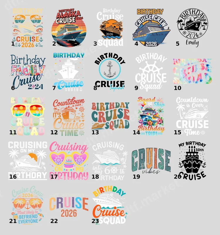See allCelebrate your special day at sea with this vibrant "BIRTHDAY CRUISE SQUAD" DTF transfer. Featuring groovy, retro-inspired lettering and a charming cruise ship icon, this design radiates fun and festivity. It's the perfect ready to press design to commemorate a birthday cruise with your favorite people. This festive design is ideal for anyone planning a birthday celebration aboard a cruise ship, family vacations, or friend getaways. Create memorable matching shirts for your whole group, craft unique souvenirs, or give it as a thoughtful gift to the birthday honoree or event organizer. It’s perfect for milestone birthdays or any fun group cruise trip. Our premium heat press transfers ensure effortless application on a variety of fabrics, including cotton, polyester, and blends. Simply use a heat press at 300-325°F for 15 seconds with medium pressure. These iron on decals require no weeding or masking, making the customization process quick and hassle-free, even for beginners. Experience professional-grade quality with incredibly vibrant colors, excellent wash durability, and a soft, smooth feel on your garments. Each apparel transfer is printed on high-quality DTF film with a strong adhesive, guaranteeing that your custom creation remains stunning and resists cracking or peeling through many washes and wears.