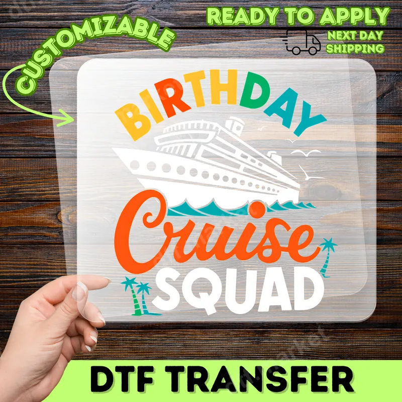 See allThis vibrant Birthday Cruise Squad DTF transfer features a festive cruise ship illustration, complete with ocean waves and tropical palm trees. The playful, multi-colored lettering for "BIRTHDAY" combined with "Cruise SQUAD" in a crisp white and orange makes this design pop. It’s a perfect ready to press transfer for anyone planning a fun-filled birthday celebration at sea, capturing the excitement and camaraderie of a group vacation. This heat press design is ideal for groups embarking on a birthday cruise, whether it's for family, friends, or a couple. It makes a fantastic custom transfer for creating matching t-shirts, tank tops, or tote bags for a memorable trip. Perfect for birthday parties, bachelorette cruises, family reunions at sea, or as a fun gift for the whole cruise crew to wear. Applying this high-quality iron on transfer is straightforward for both beginners and experienced crafters. Our direct to film transfer works seamlessly on a wide range of fabrics, including cotton, polyester, and various blends. For best results, use a heat press at 300-325°F for 15 seconds with medium pressure. It's an easy-to-use heat press ready design that requires no weeding, saving you time and effort. Experience the superior quality of our DTF transfers. Each shirt design is crafted using professional-grade DTF film, ensuring vibrant colors, exceptional detail, and a soft-to-the-touch feel that won't crack or fade. The strong adhesive provides lasting durability, making your custom apparel stand out trip after trip. Enjoy professional results with every application.