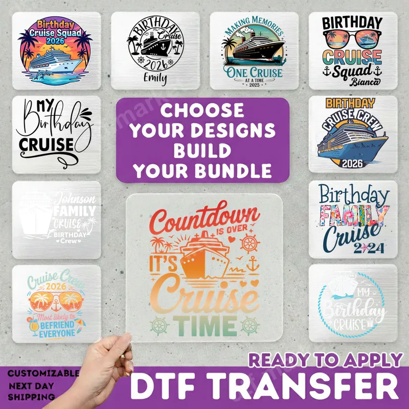 See allSet sail in style with our festive Birthday Cruise DTF transfers! This collection features a variety of vibrant, ready to press designs perfect for commemorating your special birthday celebration at sea. From detailed cruise ships gliding through tropical waters with dolphins and palm trees, to elegant script reading 'My Birthday Cruise,' and fun group designs like 'Birthday Cruise Squad' or 'Birthday Family Cruise,' each heat press design captures the excitement and joy of a nautical getaway. Our direct to film transfers ensure every detail, from ocean waves to celebratory year dates, is crisp and colorful, making your custom apparel truly stand out. These versatile iron on transfers are ideal for anyone planning a birthday cruise, whether it's a milestone celebration, a family reunion at sea, or a fun trip with friends. Perfect for creating matching t-shirts, tank tops, or tote bags for your 'Cruise Crew' or 'Birthday Squad,' they also make fantastic personalized gifts for the birthday honoree. Imagine surprising everyone with custom shirts for photo ops on deck or during shore excursions. These designs are perfect for pre-cruise parties, the voyage itself, or as cherished keepsakes long after you’ve disembarked. Applying your Birthday Cruise apparel transfer is a breeze! Each heat press ready design works beautifully on a wide range of fabrics including 100% cotton, polyester, cotton/poly blends, and even tri-blends. For best results, use a heat press at 300-325°F for 15 seconds with medium pressure, then peel cold. While a heat press is recommended for professional results, these durable transfers can also be applied with a household iron with careful attention to pressure and temperature. The best part? No weeding required, saving you time and effort. Experience superior quality with our professional-grade DTF transfers. Engineered for durability, these designs boast vibrant colors that pop and a soft, flexible feel that seamlessly integrates with your garment. Our specialized DTF film ensures excellent adhesion, making your custom shirt design crack-resistant and washable, so your birthday cruise memories will last for years to come. Enjoy a professional finish every time, transforming ordinary apparel into personalized celebratory wear.