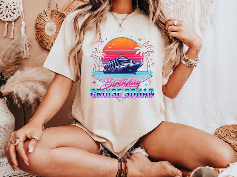 See allDive into nostalgia with this vibrant "Birthday Cruise Squad" DTF transfer, featuring a stunning retro 80s synthwave aesthetic. This eye-catching design showcases a sleek cruise ship sailing past palm trees under a radiant sunset and starry sky, all framed by a futuristic grid. It's the perfect ready to press transfer to capture that ultimate vacation vibe for your group. This unique design is ideal for birthday celebrants and their entire "squad" embarking on a cruise adventure. Whether it's a milestone birthday, a family reunion at sea, or a fun friends' getaway, this heat press design makes coordinating matching outfits effortless. It's also a fantastic gift idea for anyone planning a special birthday cruise, adding a personalized touch to their celebration. Applying this premium heat transfer is quick and easy for anyone to do. Our direct to film transfer works beautifully on a wide variety of materials, including cotton, polyester, and their blends. Simply use a heat press set to 300-325°F for 15 seconds with medium pressure, or even a household iron for smaller applications. No complex weeding required, just press and peel for a professional finish every time. Experience superior quality with every t-shirt transfer you create. Our DTF transfers are known for their vibrant, fade-resistant colors and exceptional durability, resisting cracks and peels wash after wash. The soft-touch feel ensures maximum comfort on any garment, making it an excellent apparel transfer choice for any custom clothing project.
