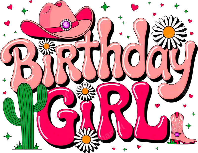 See allCelebrate her special day with our vibrant 'Birthday Girl' DTF transfer! This fun design features bold, bubbly retro lettering in shades of pink, adorned with classic cowgirl elements like a stylish pink hat with a jewel, a matching western boot, and a desert cactus. Scattered hearts and daisies add a sweet touch. This high-quality direct to film transfer is ready to press, making it easy to create personalized apparel for the birthday girl. This charming heat press transfer is ideal for anyone celebrating a birthday with a touch of Western flair, especially young girls, teens, or women who love the cowgirl aesthetic. It's perfect for birthday parties, themed events, or as a unique gift. Use this iron on decal to create custom birthday shirts, tote bags, or even matching outfits for a birthday squad, adding a memorable touch to any celebration. Applying this apparel transfer is simple and versatile. It works wonderfully on a wide range of materials, including cotton, polyester, and various fabric blends. For best results, use a heat press at 300-325°F for 15 seconds with medium pressure, then cold peel the film. While a heat press is recommended for professional results, you can also achieve great outcomes with a household iron. Best of all, there's no tedious weeding required, saving you time and effort. You'll love the exceptional quality of our heat press ready designs. Each shirt design boasts vibrant, true-to-color inks that resist cracking, peeling, and fading, ensuring your custom creation looks fantastic wash after wash. The professional DTF film provides a soft, flexible feel that seamlessly integrates with the fabric, along with a strong adhesive for long-lasting wear. Get professional-looking results with minimal effort.