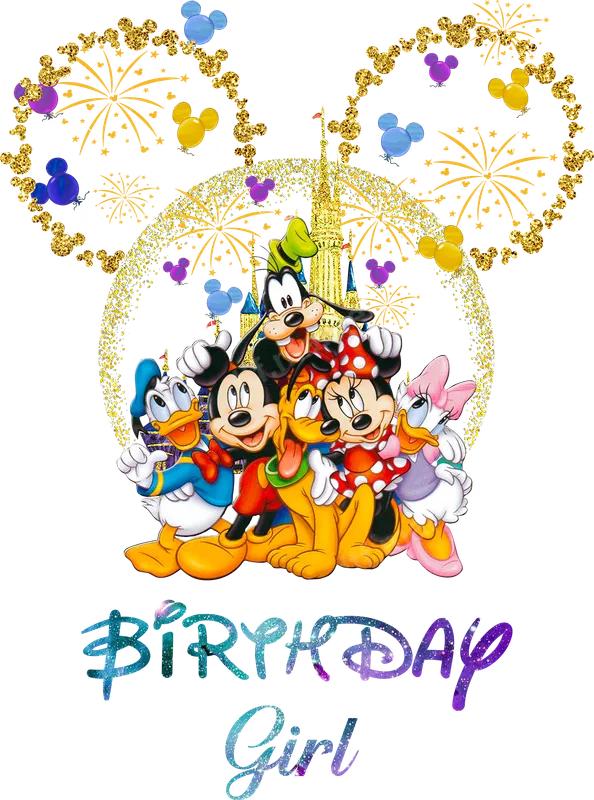 Birthday Girl Mickey & Friends Castle Glitter Fireworks DTF Transfer