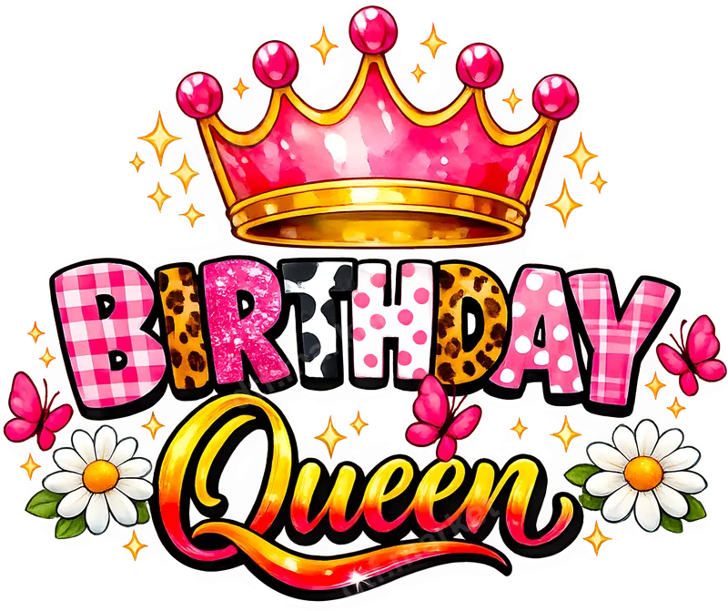 See allCelebrate her special day with our dazzling "Birthday Queen" DTF transfer, a ready to press design featuring a regal pink and gold crown. The bold "BIRTHDAY" text boasts trendy patterns like pink plaid, leopard print, shimmering pink glitter, playful cow print, and polka dots. The elegant "Queen" script, with its vibrant yellow-orange gradient, is framed by cheerful pink butterflies, sweet white daisies, and golden starbursts for extra glamour. This glamorous iron on transfer is perfect for anyone celebrating their birthday in style – from teens to grandmas. It's an ideal gift for a birthday girl or a fun outfit for a party. Easily design custom t-shirts, tote bags, or any apparel to commemorate the occasion with a festive and fashionable statement. Applying this professional direct to film transfer is straightforward. It adheres beautifully to cotton, polyester, and blends. For best results, use a heat press at 300-325°F for 15 seconds with medium pressure, then cool peel. No specialized skills or weeding are required, ensuring a smooth application for both crafters and beginners. Our heat press ready shirt design uses premium DTF film and high-quality inks for vibrant colors and crisp details. The durable finish is crack-resistant and incredibly soft to the touch, providing superior comfort and longevity compared to traditional vinyl transfers. Enjoy a lasting, professional-looking garment that stands up to washes, ensuring your birthday design remains stunning for many celebrations.