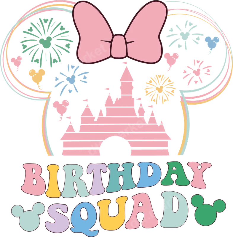 See allThis enchanting DTF transfer features a whimsical mouse ear silhouette adorned with a playful pink bow, framing a majestic pastel castle. Fireworks burst around the castle, echoing the magic of celebration, while tiny mouse-head balloons float by. The vibrant, retro-inspired text "BIRTHDAY SQUAD" is rendered in an array of soft pastel hues, making this design a perfectly cheerful and ready to press graphic for any special birthday outing. It captures a nostalgic, joyful spirit, ideal for creating memorable apparel. Gather your crew and make a statement with this unique birthday squad heat transfer. It's designed for anyone celebrating a birthday, especially those planning a themed trip, a family vacation, or a party with friends. Perfect for moms, daughters, groups of friends, or entire families looking for coordinating outfits. This festive heat press design is an excellent choice for birthday parties, annual trips to magical theme parks, or as a thoughtful gift for the birthday person and their entourage. Create matching t-shirts or accessories that stand out! Applying this iron on transfer is quick and easy, ensuring professional results every time. Our high-quality direct to film transfers adhere beautifully to a wide variety of fabrics, including cotton, polyester, and cotton/poly blends. For best results, use a heat press at 300-325°F for 15 seconds with medium, even pressure. This shirt design eliminates the need for tedious weeding or layering, making your customization process smooth and efficient. Simply press and peel! Experience superior quality with this durable apparel transfer. Crafted from premium DTF film, it ensures vibrant colors that pop and a soft, flexible feel that won't crack or peel over time. The strong adhesive provides exceptional wash durability, keeping your custom garments looking fantastic even after many cycles. Our heat press ready designs deliver professional-grade results, allowing you to create personalized items that truly last and impress.