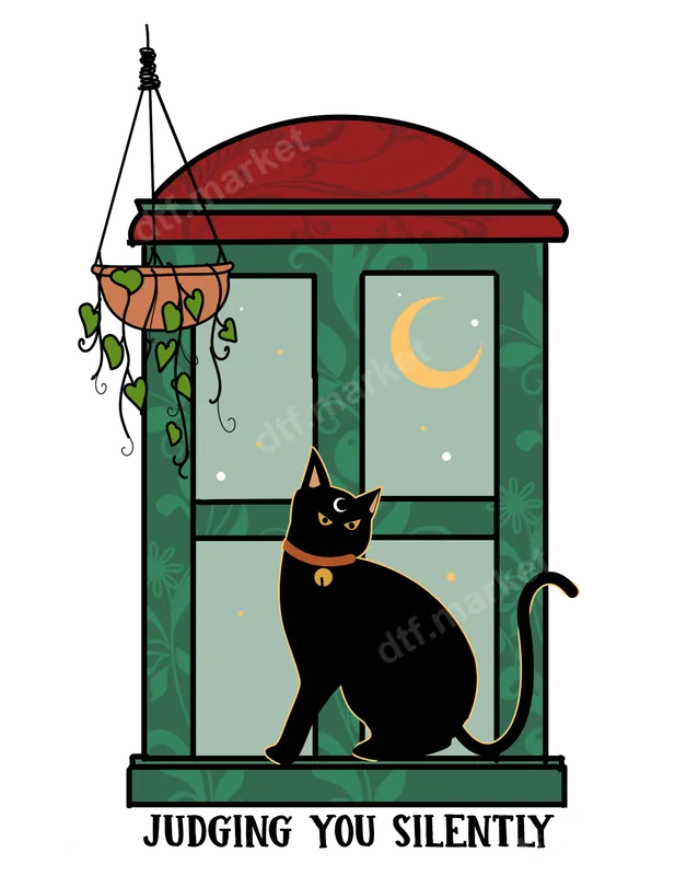 See allThis charming DTF transfer features a regal black cat with a subtle crescent moon detail on its forehead, perched elegantly in a whimsical window frame adorned with intricate floral patterns and a hanging plant. The cat, with its intense gaze, sits beneath a night sky complete with a golden crescent moon and twinkling stars. Below the captivating scene, the bold text "JUDGING YOU SILENTLY" adds a humorous, sarcastic touch, making this high-quality direct to film transfer a perfect way to express your inner feline's attitude. It’s a ready to press design, making custom apparel creation simple and fun. Ideal for cat enthusiasts, sarcastic humor fans, pet owners, and anyone who appreciates a bit of witty charm, this heat press design makes an excellent gift. Perfect for birthdays, holidays, or just because, it's a thoughtful present for friends and family who adore feline companions and a good laugh. Use this unique iron on transfer to personalize casual wear, create unique items for pet events, or add personality to your everyday wardrobe with ease. Applying this durable heat press transfer is incredibly simple. It works flawlessly on a wide range of materials, including cotton, polyester, and various blends, ensuring versatility for all your projects. For best results, use a heat press at 300-325°F for 15 seconds with medium pressure, then perform a cold peel. There's no weeding or intricate prep work needed, making it a hassle-free iron on decal experience for all your DIY apparel projects. Our apparel transfer boasts vibrant, crisp colors and exceptional detail that stands up to countless washes without cracking or fading. The soft-touch finish integrates beautifully with the fabric, ensuring comfortable wear. Crafted with professional-grade DTF film and strong adhesive, this t-shirt transfer delivers a long-lasting, high-quality result, turning any garment into a statement piece you'll love.