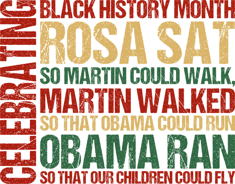 See allThis impactful DTF transfer proudly celebrates Black History Month with a powerful quote honoring the legacy of pivotal figures. Featuring distressed typography in rich reds, golden yellows, and deep greens, the design reads: "CELEBRATING BLACK HISTORY MONTH. ROSA SAT SO MARTIN COULD WALK, MARTIN WALKED SO THAT OBAMA COULD RUN, OBAMA RAN SO THAT OUR CHILDREN COULD FLY." This ready to press design encapsulates generations of progress and inspiration. Perfect for history enthusiasts, educators, civil rights advocates, and anyone passionate about social justice, this heat press transfer is ideal for creating meaningful apparel. It makes an excellent gift for students, teachers, and community leaders during Black History Month, Juneteenth celebrations, or any event dedicated to honoring African American heritage and achievements. Inspire conversations and showcase pride with this powerful statement piece. Our high-quality DTF transfers are incredibly versatile and easy to apply. They work seamlessly on a wide range of materials, including cotton, polyester, and various fabric blends. For best results, use a heat press at 300-325°F for 15 seconds with medium, even pressure. This iron on transfer can also be applied with a household iron, following included instructions. No weeding or intricate layering is required, making your customization process smooth and efficient. Experience vibrant colors and exceptional durability with every application. Our professional-grade direct to film transfer ensures a soft-to-touch finish that is crack-resistant and stands up beautifully to repeated washes. The strong adhesive ensures your shirt design remains securely bonded to your garment, providing a lasting, professional-quality finish that celebrates a timeless message of progress and hope.