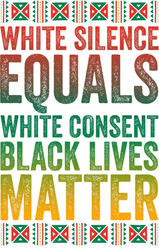 See allThe design features the powerful statement "WHITE SILENCE EQUALS WHITE CONSENT BLACK LIVES MATTER" in a distressed, bold font. The text transitions through a vibrant gradient of red, green, and gold, framed by traditional Pan-African geometric patterns. This ready to press DTF transfer carries a strong message of social justice and racial equality. It's a visually impactful design perfect for making a clear stand. This design is ideal for activists, community organizers, allies, and anyone committed to the Black Lives Matter movement and anti-racism. It's perfect for protest events, rallies, Juneteenth celebrations, Black History Month, or simply as everyday wear to express your values. Create impactful apparel for yourself or as a thoughtful gift for fellow advocates, sparking conversations and spreading awareness. Our premium DTF transfer works seamlessly on a wide range of fabrics, including cotton, polyester, and various blends, making it a versatile iron on transfer solution. Applying this heat press design is straightforward: use a heat press at 300-325°F for 15 seconds with medium pressure, then cold peel. For smaller projects, a household iron can also be used. Enjoy the ease of a ready to press transfer with no tedious weeding required. Experience professional-grade quality with our durable direct to film transfer. Each heat transfer boasts incredibly vibrant, fade-resistant colors and a soft-to-touch finish that feels comfortable on any garment. Printed on high-quality DTF film with a strong, flexible adhesive, your custom transfer will be crack-resistant and withstand numerous washes, ensuring your message remains clear and impactful for a long time.