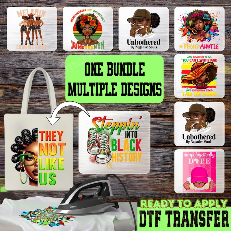 See allThis exclusive DTF transfer bundle celebrates the strength, beauty, and empowerment of Black women, offering a collection of nine unique and vibrant designs. Featuring powerful messages like "Juneteenth," "Unbothered By Negative Souls," "Steppin' Into Black History," and "I Am The Storm," each high-quality DTF transfer embodies pride and self-expression. These eye-catching graphics are more than just designs; they are statements, all ready to press for immediate application onto your favorite items. This collection is perfect for individuals who want to proudly showcase their heritage and attitude. Ideal for celebrating Black History Month, Juneteenth, or for everyday wear to express personal style and confidence. Whether you're looking to personalize a gift for a "Proud Auntie," a friend who values bold self-expression, or simply to uplift your own wardrobe, these designs resonate with themes of identity, resilience, and unapologetic self-love. Applying these premium direct to film transfers is a breeze, making customization accessible for everyone. Each design can be effortlessly heat pressed onto a wide variety of fabrics, including cotton, polyester, and their blends, ensuring versatility for all your projects. For optimal results, use a heat press at 300-325°F for 15 seconds with medium, even pressure. If a heat press isn't available, a household iron can also be used for beautiful, lasting results. Best of all, there's no tedious weeding or layering involved – simply press and peel! Experience the superior quality of our heat press designs, crafted to deliver incredibly vibrant colors and sharp, intricate details that truly stand out. Our professional-grade DTF film ensures each ready to press transfer is not only beautiful but also highly durable. These apparel transfers are crack-resistant, peel-resistant, and remain soft to the touch after application, providing a comfortable, long-lasting finish that will keep your garments looking fresh wash after wash.