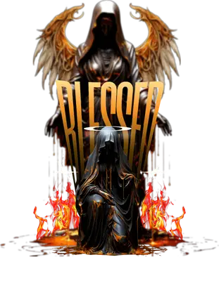Blessed Gothic Hooded Figure DTF Transfer with Gold Wings & Flames