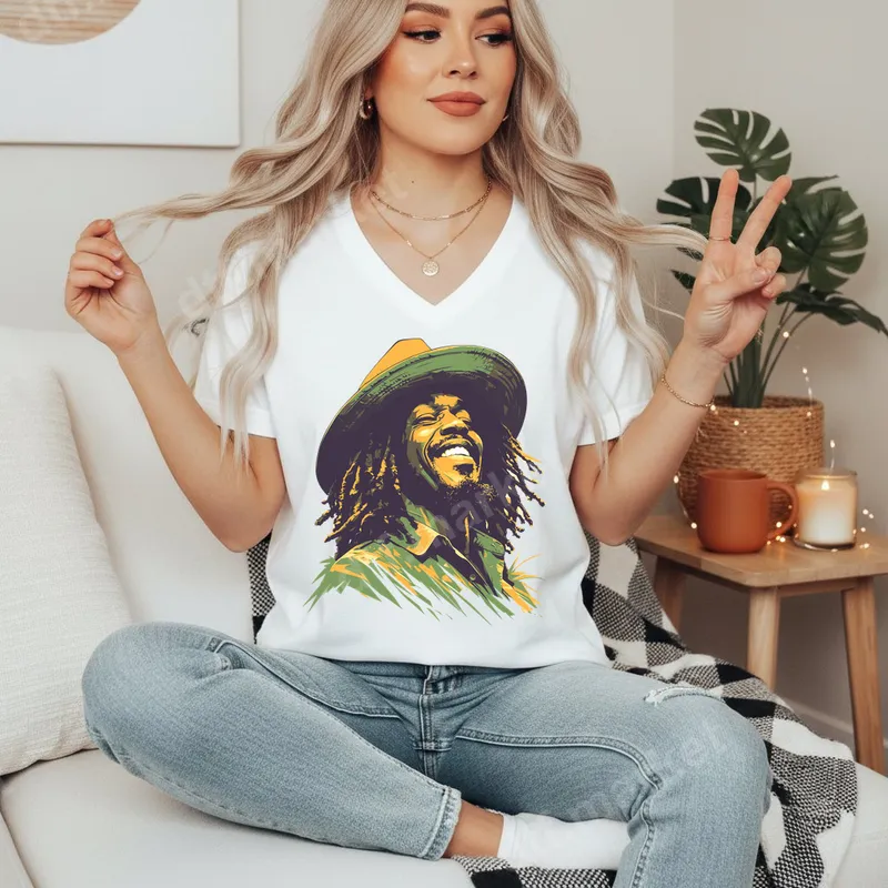See allThis vibrant DTF transfer captures the iconic smile and spirit of Bob Marley, rendered in a dynamic, illustrative style with his signature dreadlocks and hat. Perfect for fans of reggae music and cultural legends, this ready to press design brings a piece of music history to your wardrobe. As a high-quality direct to film transfer, it's designed for effortless application and lasting appeal, embodying the positive vibes of the legendary artist. This unique Bob Marley heat transfer is an ideal choice for anyone looking to express their love for reggae, peace, and music. It makes a fantastic gift for birthdays, holidays, or any special occasion for fellow Bob Marley enthusiasts and music lovers. Great for personalizing apparel for concerts, festivals, or simply adding a touch of laid-back cool to your everyday style, this design is sure to stand out. Applying this durable heat press design is simple and efficient. Our versatile iron on transfer adheres beautifully to a wide range of materials, including 100% cotton, 100% polyester, and cotton/poly blends. For best results, use a heat press at 300-325°F for 15 seconds with medium pressure, followed by a cold peel. No tedious weeding is required, making your customization process quick and hassle-free, whether you're using a professional heat press or a household iron. Experience professional-grade results with our premium Bob Marley apparel transfer. Crafted with vibrant, fade-resistant inks and a strong adhesive, this DTF transfer ensures a soft-to-the-touch feel that won't crack or peel, even after multiple washes. Enjoy bright colors and crisp details that bring your favorite music icon to life on any garment, making every piece a statement of style and passion.