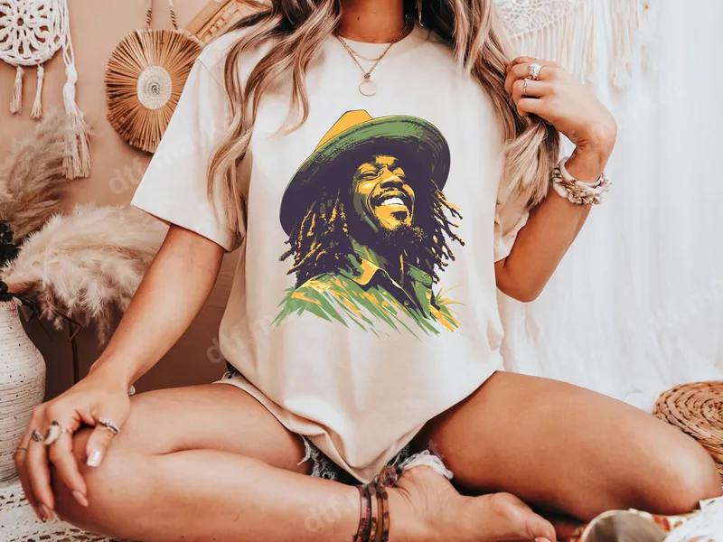 See allBring the spirit of reggae to life with this vibrant Bob Marley DTF transfer. Featuring a stylized portrait of the legendary musician with his iconic dreadlocks and smile, this design captures his joyful energy. The rich colors of green, yellow, and purple hues create a distinctive, artistic look that stands out. This high-quality DTF transfer is ready to press, allowing you to effortlessly create custom apparel and accessories. This heat press design is perfect for dedicated reggae fans, music lovers, and anyone who appreciates iconic pop culture figures. It makes an excellent gift for birthdays, music festivals, concerts, or just to add some positive vibes to your wardrobe. Whether you're customizing a t-shirt for a casual day out or preparing apparel for a themed event, this Bob Marley design will surely spread good cheer and a sense of rhythm. Applying this direct to film transfer is straightforward and efficient. It works beautifully on a wide range of fabrics including cotton, polyester, and various blends, making it versatile for many projects. For best results, use a heat press at 300-325°F for 15 seconds with medium pressure. It's also suitable for application with a household iron, following simple instructions. Enjoy a hassle-free process with no weeding required, saving you valuable time and effort. Our DTF transfers are crafted for exceptional durability and visual appeal. Expect vibrant, crisp colors that resist cracking and fading, even after multiple washes. The professional DTF film ensures a soft touch and strong adhesive properties, providing a lasting finish that feels integrated with the fabric. Elevate your custom creations with this superior-quality iron on transfer, designed to make a statement wherever you go.