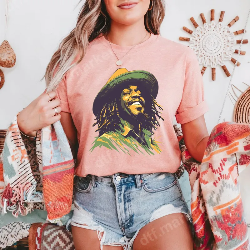 See allThis vibrant direct to film transfer captures the joyful spirit of reggae legend Bob Marley, depicted with his iconic dreadlocks and a wide, uplifting smile. The art style features bold lines and a dynamic color palette, making it a standout graphic for any garment. This ready to press DTF transfer embodies the positive energy and timeless appeal of the music icon, perfect for creating unique apparel. This iconic Bob Marley design is ideal for music lovers, reggae fans, and anyone who appreciates legendary musicians and positive vibes. It's a perfect shirt design for casual wear, music festivals, concerts, or as a thoughtful gift for birthdays, Father's Day, or just because. Express your love for reggae culture and its pioneer with this unique heat press design. Applying this iron on transfer is simple and efficient, suitable for both professionals and DIY enthusiasts. It adheres beautifully to a wide range of fabric types, including cotton, polyester, and various blends, ensuring versatility. For best results, use a heat press at 300-325°F for 15 seconds with medium pressure, then perform a cool peel. Unlike traditional vinyl transfers, there's no weeding required, saving you time. Experience superior quality with this professional-grade apparel transfer. Our DTF transfers are known for their exceptional vibrancy, ensuring Bob Marley's joyful expression truly pops on any fabric. The print is highly durable, crack-resistant, and incredibly soft to the touch, providing a comfortable wear. Each heat transfer is printed on premium DTF film with a strong, long-lasting adhesive, ensuring your custom transfer looks great wash after wash.