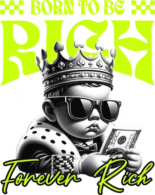 Unleash your inner mogul with this captivating 'Born To Be Rich' DTF transfer, an audacious design showcasing a cool baby king adorned with a regal crown and stylish sunglasses, holding a crisp $100 bill beside a stack of poker chips. The powerful message 'BORN TO BE RICH' and 'Forever Rich' pops in vibrant neon green, set against the detailed grayscale illustration, creating a striking visual that's truly ready to press onto your favorite apparel. This bold design is perfect for streetwear enthusiasts, aspiring entrepreneurs, hip-hop fashion fans, or anyone with a 'money mindset' and a strong sense of ambition. It makes an excellent gift for birthdays, motivational events, or as a statement piece for casual wear. Small t-shirt businesses and crafters will find this iron on transfer an exciting addition to their collection, offering a unique heat transfer design for customers seeking edgy and aspirational apparel. Applying this heat press transfer is a breeze, suitable for cotton, polyester, cotton-poly blends, and even nylon fabrics. Achieve professional results using a heat press set to 300-325°F for 15 seconds with medium pressure, or easily use a household iron. There's no tedious weeding required – just peel and press! It's ideal for creating custom t-shirts, hoodies, sweatshirts, tote bags, denim jackets, and even ironic baby onesies. For long-lasting vibrancy, wash your finished garment inside out and tumble dry on low. Experience superior quality with this ready to press transfer, boasting vibrant, full-color printing with exceptional fine detail. The design is crack-resistant and soft to the touch, avoiding the heavy, stiff feel of traditional vinyl. Each direct to film transfer is printed on premium DTF film with a robust adhesive backing, ensuring professional-grade results and outstanding durability every time you create custom apparel.