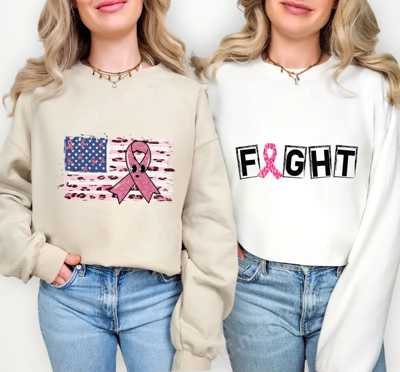 See allRally for a cause with our empowering Breast Cancer Awareness DTF transfer designs, ready to press onto your favorite apparel. Choose between two impactful options: the bold 'FIGHT' design with a pink ribbon replacing the 'I', or a patriotic American flag featuring pink ribbon stars and leopard print stripes, accented by a glittery awareness ribbon. Both designs are vibrant and inspiring, perfect for raising awareness and showing solidarity. These meaningful heat transfer designs are perfect for survivors, supporters, friends, and family impacted by breast cancer. They are ideal for Breast Cancer Awareness Month, charity walks, fundraising events, or as an everyday statement of hope and resilience. Make thoughtful gifts for loved ones, or wear them yourself to show unwavering support and encourage others to join the fight for a cure. Applying these ready to press transfers is quick and easy, requiring no weeding. Our high-quality iron on transfers adhere beautifully to a wide range of materials, including 100% cotton, 100% polyester, and blends. For best results, use a heat press at 300-325°F for 15 seconds with medium pressure, then peel cold. A household iron can also be used, making custom apparel accessible for all projects. Crafted using professional-grade DTF film, these durable heat press transfers boast exceptional print quality with vivid, crack-resistant colors. The designs are wash-fast and incredibly soft to the touch, ensuring your apparel remains comfortable and looks fantastic even after multiple washes. The strong adhesive provides a lasting bond to your garment, offering a professional finish that proudly displays your commitment to breast cancer awareness.
