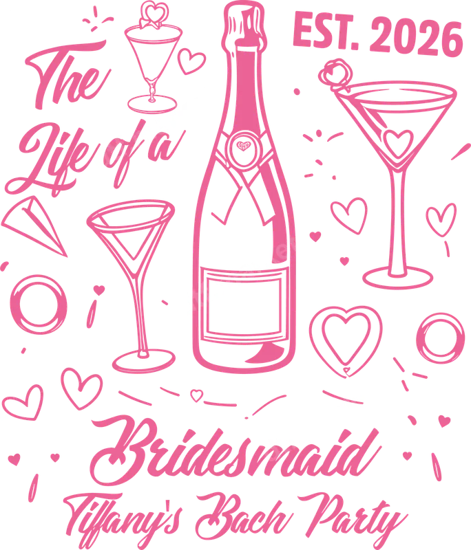 See allThe "Life of a Bridesmaid" DTF transfer is a vibrant and playful design perfect for celebrating a bachelorette party or bridal shower. Featuring stylish outlines of champagne bottles, cocktail glasses, shimmering hearts, and festive confetti, this ready to press transfer captures the joyful spirit of pre-wedding festivities. The design also includes "EST. 2026" and a customizable spot for the bride's name and "Bach Party", making it uniquely personal for any celebration. This delightful heat transfer is ideal for bridesmaids, maid of honors, or any member of the bridal party looking to create custom apparel for the big event. It’s perfect for bachelorette weekends, bridal showers, engagement parties, or as a thoughtful gift for the entire squad. Imagine coordinating t-shirts, hoodies, or beach bags for a memorable girls' trip, celebrating "The Life of a Bridesmaid" with style and sparkle. Applying this heat press design is incredibly easy, making it perfect for DIY projects or professional use. Our iron on transfers work flawlessly on a wide range of fabrics, including cotton, polyester, and their blends. For best results, use a heat press at 300-325°F for 15 seconds with medium pressure. It's also suitable for application with a household iron, ensuring flexibility. Enjoy a smooth, weed-free process with every direct to film transfer. Crafted with high-quality DTF film and professional-grade inks, this custom transfer promises vibrant colors and exceptional durability. The design is engineered to be crack-resistant, fade-resistant, and incredibly soft to the touch, ensuring your personalized garments look fantastic wash after wash. Choose our premium apparel transfer for a lasting impression and a truly unforgettable celebration of love and friendship.