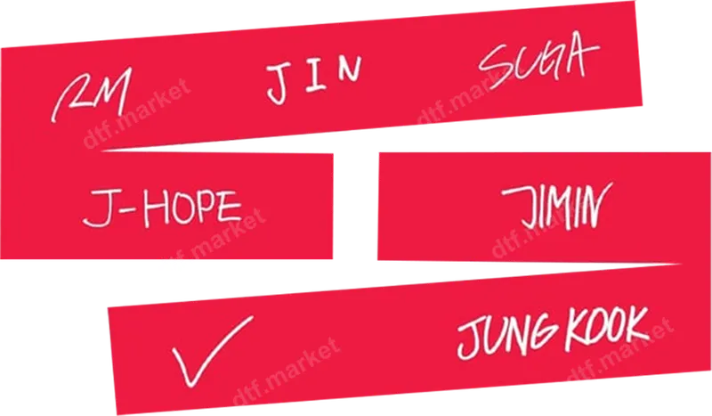 See allExpress your dedication to the Bangtan Boys with this iconic BTS member names DTF transfer. Featuring RM, Jin, Suga, J-Hope, Jimin, and Jung Kook in a playful handwritten font on bold red rectangular blocks, complete with a checkmark, this design is a must-have for any true ARMY. This high-quality, ready to press DTF transfer captures the fun of the global K-pop sensation, perfect for customizing your gear. This unique design is crafted for devoted BTS ARMY and K-pop enthusiasts. It’s ideal for customizing apparel for concerts, fan gatherings, or showcasing your fandom daily. Make a statement at a watch party, create a memorable gift for a fellow fan, or design a custom t-shirt for a birthday. This versatile heat press transfer is fantastic for personalizing gifts for teens, young adults, and anyone who loves BTS. Applying this vibrant iron on transfer is simple and straightforward. Our direct to film transfer works beautifully on cotton, polyester, and blends. For best results, use a heat press at 300-325°F for 15 seconds with medium pressure, then cold peel. A household iron can also be used. Enjoy the convenience of a ready-to-apply design with no weeding or layering required. You'll love the professional quality of our apparel transfers. Each DTF transfer uses premium materials, ensuring vibrant colors that resist cracking or fading. The result is a soft-to-touch design that seamlessly integrates with your garment, offering excellent durability and comfort. Elevate your wardrobe with a durable and stylish t-shirt transfer that stands the test of time and showcases your K-pop passion.