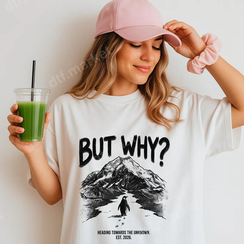 See allDive into quirky humor with our "But Why?" penguin DTF transfer. This unique design features a determined penguin making its way through a detailed, rocky mountain landscape, accompanied by the bold question "BUT WHY?" and the subtly humorous tagline "HEADING TOWARDS THE UNKNOWN. EST. 2026." This direct to film transfer is perfect for those who appreciate a touch of existential whimsy and are ready to press their personality onto their wardrobe. This ready to press transfer is ideal for Gen Z trendsetters, meme enthusiasts, and anyone who enjoys witty, slightly absurd humor. It makes an excellent gift for friends, family, or yourself, especially for casual wear, outdoor adventures, or simply expressing a relatable sentiment. Perfect for adding a dash of lightheartedness to everyday outfits or for making a statement at social gatherings. Applying this premium heat transfer is incredibly easy, making it perfect for DIY apparel customization. Simply use a heat press at 300-325°F for 15 seconds with medium pressure, or apply with a household iron. Our transfers ensure a smooth, professional finish with no weeding required, saving you time and effort. It adheres beautifully to cotton, polyester, and various fabric blends. Crafted with professional-grade DTF film, this heat press design boasts vibrant colors and sharp details that won't crack or fade over time. The result is a soft-to-touch, durable graphic that feels like part of the fabric, ensuring long-lasting wear. Elevate your apparel with a high-quality iron on transfer that stands out and sparks conversation.