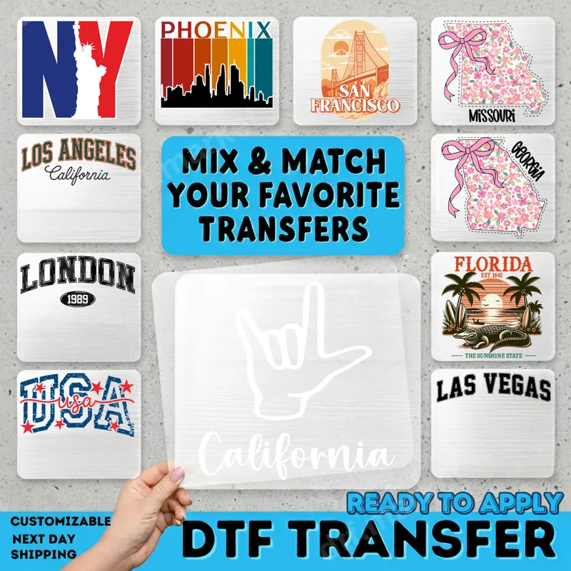 See allThis eye-catching DTF transfer features a stylish white script "California" alongside the universally recognized "I Love You" hand sign, often associated with ASL or "rock on" culture. The clean lines and expressive gesture create a versatile design perfect for showcasing state pride or a message of affection. This high-quality DTF transfer is ready to press, making it simple to add a personalized touch to any garment. Ideal for proud Californians, visitors who fell in love with the Golden State, or anyone wanting to express love and positivity. It makes a fantastic gift for friends, family, or even yourself. Perfect for everyday wear, casual events, music festivals, or simply to represent your favorite state in a unique and trendy way. Use this versatile heat press design for local events, souvenir shops, or personal apparel. Our direct to film transfer technology ensures a seamless application process. This ready to press transfer works beautifully on a wide range of materials, including cotton, polyester, and various fabric blends. For best results, apply with a heat press at 300-325°F for 15 seconds with medium pressure, then cold peel. For smaller items or home use, a household iron can also be used. Forget the hassle of weeding vinyl transfers; this iron on is ready to go! Experience superior quality with our professional-grade DTF transfers. Designed for durability, these apparel transfers are incredibly vibrant, crack-resistant, and feature a soft hand feel that seamlessly integrates with the fabric. Each heat transfer is printed on premium DTF film with a strong, long-lasting adhesive, ensuring your custom shirt design stands out and withstands numerous washes.