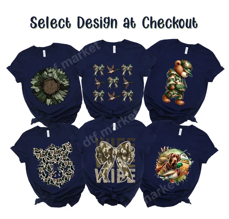 See allThis collection features a diverse range of Direct-to-Film (DTF) transfers, perfect for those who love the great outdoors, hunting, or unique camouflage styles. Each ready to press transfer offers a distinct outdoor or nature-inspired theme. Designs include a vibrant camo sunflower, a charming pattern of flying mallard ducks with camo bows, and an adorable teddy bear in a full camouflage outfit. You'll also find a camo pig outline, a bold camo bow with "WIFE" lettering, and a striking watercolor of a hunting dog with a duck. These versatile heat transfer designs are ideal for hunters, anglers, outdoor enthusiasts, and their families. They make fantastic gifts for Father's Day, birthdays for a hunting buddy, or for a proud "hunt wife." Perfect for customizing apparel for hunting trips, camping, or simply for everyday wear to express a passion for nature and the wild. These iron on decals are also great for creating personalized gear. Applying these high-quality apparel transfers is simple. Our heat press designs are compatible with cotton, polyester, and blends. For best results, use a heat press at 300-325°F for 15 seconds with medium pressure, then peel cold. A household iron can also be used. Enjoy the convenience of a ready to press transfer with no weeding, cutting, or layering required. Crafted with premium DTF film and professional inks, these direct to film transfers offer exceptional vibrancy and durability. Each custom transfer is crack-resistant, peel-resistant, and soft to the touch, ensuring lasting quality even after many washes. Trust dtf.market for superior heat press transfers that elevate your apparel.