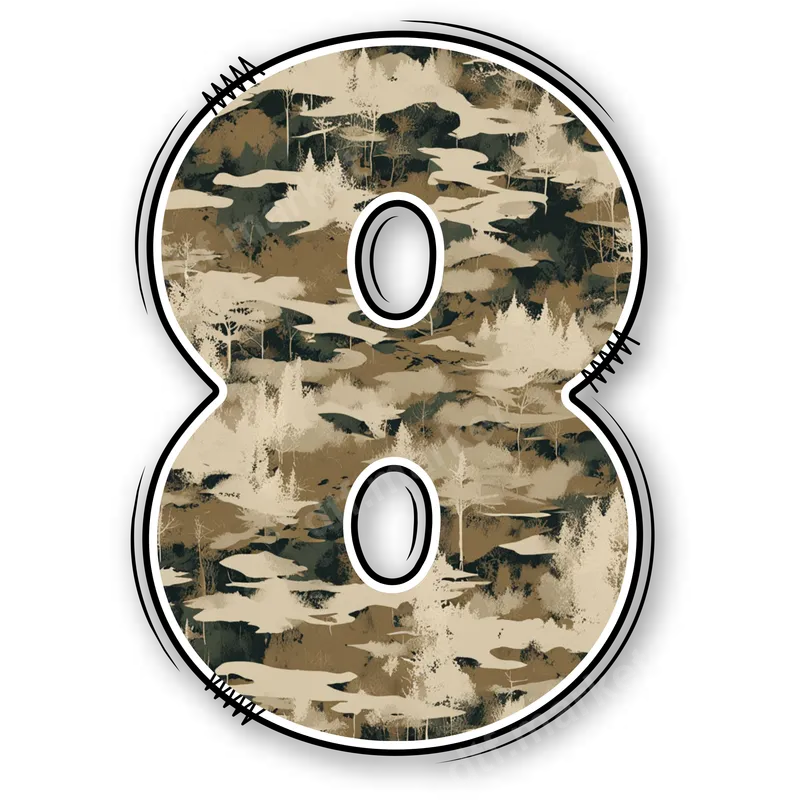 See allThis distinctive DTF transfer features the bold number 8, filled with a detailed camouflage forest pattern. The design showcases an artistic blend of trees and woodland textures in various shades of brown, green, and cream, giving it an authentic outdoor vibe. Encased within a crisp white outline and accented with a unique dashed black border, this ready to press design brings a rugged yet stylish aesthetic to any garment or accessory. Ideal for outdoor enthusiasts, hunters, and individuals who appreciate a military or tactical aesthetic, this DTF transfer is perfect for personalizing gear or apparel. It makes an excellent statement for sports jerseys, team numbers, or celebrating a significant "8" for birthdays, anniversaries, or special events. This versatile iron on decal can also be a thoughtful gift for dads, veterans, or anyone passionate about the great outdoors. Our high-quality heat press transfer is incredibly easy to apply, working seamlessly on a wide range of fabrics including cotton, polyester, and various blends. For best results, use a heat press at 300-325°F for 15 seconds with medium pressure, followed by a cold peel. If you don't have a heat press, a household iron can also be used. Forget tedious weeding; this heat press ready design is hassle-free, saving you time and effort. Experience professional-grade results with this durable apparel transfer. The vibrant colors of the woodland camouflage pattern are designed to resist cracking, peeling, and fading, ensuring your customized items look great wash after wash. Manufactured with premium DTF film and strong adhesive, this transfer offers a soft hand feel, making it comfortable to wear while delivering a high-quality, long-lasting finish on all your projects.