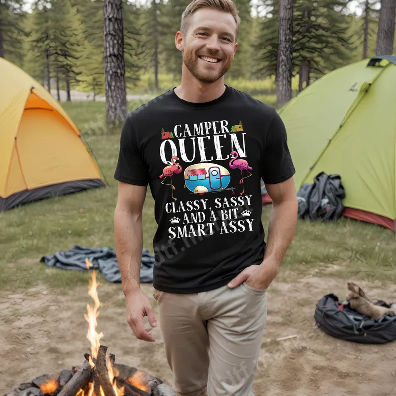 See allEmbrace your inner Camper Queen with this vibrant DTF transfer featuring a sassy quote, playful pink flamingos, and a charming retro camper. The design reads "CAMPER QUEEN CLASSY, SASSY AND A BIT SMART ASSY," adorned with whimsical camping elements like tiny tents and crowns. This high-quality direct to film transfer is perfect for adding personality to any garment, bringing a fun, bold, and humorous touch to your outdoor adventures. It arrives as a ready to press transfer, making customization quick and easy. This heat press transfer is ideal for the confident woman who loves camping, RV life, and isn't afraid to show her witty side. It makes an excellent gift for friends, moms, or grandmas who are camping enthusiasts, perfect for birthdays, Mother's Day, or as a fun surprise before a glamping trip. Whether you're gathering around a campfire or cruising in your RV, this unique apparel transfer celebrates the joy and sass of the open road. Applying this iron on transfer is straightforward. It works beautifully on a wide range of materials, including 100% cotton, 100% polyester, and cotton/poly blends. Simply use a heat press at 300-325°F for 15 seconds with medium pressure, then let it cool before peeling. Even a household iron can be used with care! There's no need for tedious weeding or intricate layering, saving you time and effort. Our DTF transfers are crafted for durability and stunning visual appeal. Enjoy vivid colors that pop, superior stretch and flexibility, and a soft-to-touch finish that won't crack or peel. Each design is printed on professional-grade DTF film with a strong, reliable adhesive, ensuring your custom transfer lasts wash after wash. Transform your clothing with ease and confidence!