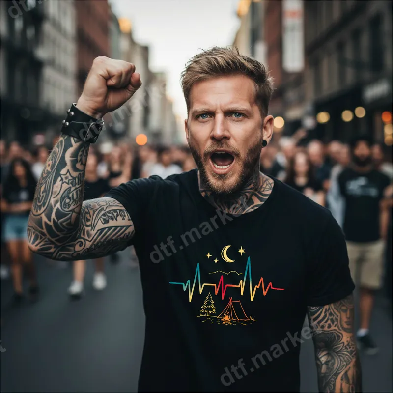 See allThis eye-catching DTF transfer features a unique design combining a vibrant, multicolored heartbeat (ECG) line with iconic outdoor elements. Above the pulse, a delicate crescent moon and twinkling stars evoke clear night skies, while below, a rustic pine tree and a cozy camping tent with a crackling campfire complete the wilderness scene. It's a ready to press design that perfectly captures the rhythm and passion of nature and adventure. This "heart for the outdoors" apparel transfer is perfect for campers, hikers, adventure seekers, and anyone who feels a deep connection to nature. It makes an excellent gift for Father's Day, birthdays, or as a custom transfer for your next camping trip or outdoor festival. Express your love for the wilderness on your favorite garments or create unique items for your outdoor-loving friends and family. Applying this durable heat transfer is simple with a heat press at 300-325°F for 15 seconds with medium pressure, or even a household iron for smaller designs. Our high-quality DTF transfers adhere beautifully to a wide range of materials, including cotton, polyester, and their blends. Forget about tedious weeding; these heat press ready designs come prepped for instant application. Crafted with professional-grade DTF film, this t-shirt transfer ensures vibrant colors that pop, crack-resistant durability, and a soft, flexible feel that seamlessly integrates with the fabric. Each heat press design promises long-lasting wear, maintaining its stunning appearance wash after wash. Elevate your apparel with a professional-looking finish that truly stands out.