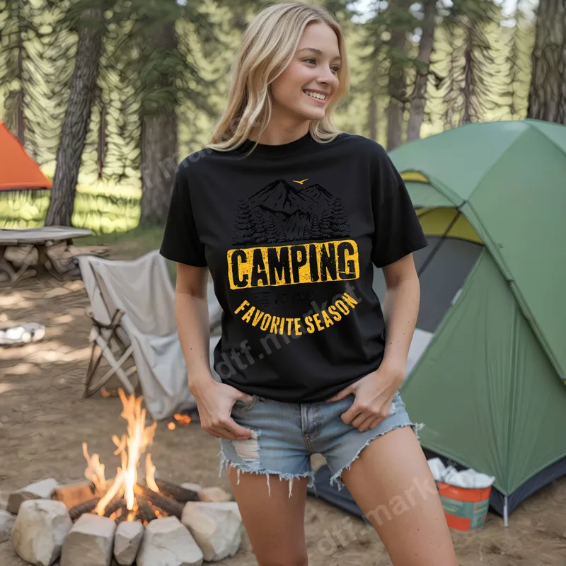 See allThis vibrant DTF transfer features a rustic 'Camping Is My Favorite Season' slogan, framed by a mountain and pine tree landscape. A small bird adds to the serene outdoor scene. The distressed yellow and black design evokes rugged adventure and nature appreciation, making it an ideal ready to press transfer for wilderness lovers. Perfect for outdoor enthusiasts, seasoned campers, hikers, and nature lovers, this versatile heat transfer makes an excellent addition to your apparel or a thoughtful gift. Ideal for summer trips, fall excursions, national park visits, or just everyday wear. It's also a fantastic iron on transfer for crafting personalized gifts for birthdays or camping adventures. Our premium heat press design is easy to apply to a variety of fabrics: cotton, polyester, and blends. Use a heat press at 300-325°F for 15 seconds with medium pressure. A household iron can also be used. No weeding is required, making it a truly heat press ready decal for effortless customization. Experience superior quality with this durable apparel transfer. Our direct to film transfers boast vibrant, crack-resistant colors and remain soft to the touch after application. Each custom transfer is printed on professional DTF film with strong adhesive, ensuring your shirt design withstands countless washes and adventures, keeping your favorite season close at hand.