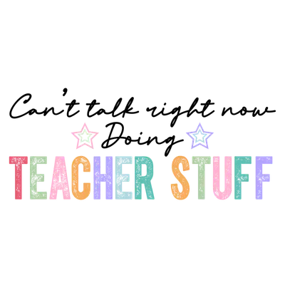 See allThis playful DTF transfer features the phrase "Can't talk right now Doing TEACHER STUFF" in a charming script and distressed pastel block letters. Adorned with delicate star accents, this ready to press design perfectly captures the busy yet joyful spirit of educators. It's an ideal way to express the dedication and humor that comes with being a teacher, making it a standout piece for any casual wear. This humorous iron on transfer is perfect for teachers, school staff, principals, and anyone celebrating their favorite educator. It makes an excellent gift for Teacher Appreciation Week, back-to-school events, end-of-year celebrations, or as a thoughtful present for a new teacher. Small t-shirt businesses and crafters will find this heat transfer design a popular choice for creating unique apparel and accessories that resonate with the educational community. Applying this heat press transfer is simple and efficient. It works beautifully on a wide variety of materials including cotton, polyester, cotton-poly blends, and even nylon. For best results, use a heat press at 300-325°F for 15 seconds with medium pressure, or apply with a household iron. There's no weeding required—just peel and press for an instant update. This versatile design is perfect for custom t-shirts, cozy hoodies, sturdy tote bags, charming pillow covers, and even fun baby onesies or denim jackets. To ensure lasting durability, wash garments inside out and tumble dry on low heat. Our ready to press transfer ensures vibrant, full-color printing with exceptional detail, bringing your designs to life. Crafted to be crack-resistant and soft to the touch, it avoids the heavy, rigid feel often associated with traditional vinyl transfers. Each direct to film transfer is meticulously printed on premium DTF film, featuring a strong adhesive backing to guarantee professional-quality results for every project.