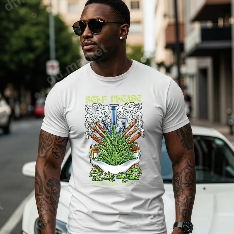 See allThis vibrant DTF transfer showcases a bold design featuring a prominent cannabis leaf, a classic bong, and several rolled blunts, all amidst swirling smoke. The playful text "SELF PLEASE" appears at the top, with "B R A I N K I L L I N G A W A Y" subtly beneath, setting a relaxed and self-indulgent vibe. This ready to press transfer is perfect for adding a unique, edgy statement to your wardrobe or merchandise. Designed for cannabis enthusiasts, those who appreciate adult humor, or anyone seeking a laid-back, expressive style, this heat press design is ideal for casual wear, social gatherings, or as a fun gift. It's great for personalizing garments for 4/20 celebrations, music festivals, or just lounging at home. Surprise a friend with this cool graphic iron on transfer that speaks to their chill persona. Applying this custom transfer is a breeze on various fabric types, including cotton, polyester, and their blends. For optimal results, use a heat press at 300-325°F for 15 seconds with medium pressure. Unlike traditional vinyl transfer methods, there's no weeding required, making the application quick and hassle-free. Detailed instructions are included to ensure a perfect, long-lasting finish every time. Each apparel transfer is crafted using professional-grade DTF film, ensuring incredible vibrancy, exceptional crack resistance, and a soft, smooth feel on any garment. The strong adhesive guarantees your design stays put, wash after wash. Experience premium quality with this durable heat transfer that maintains its sharp details and vivid colors.
