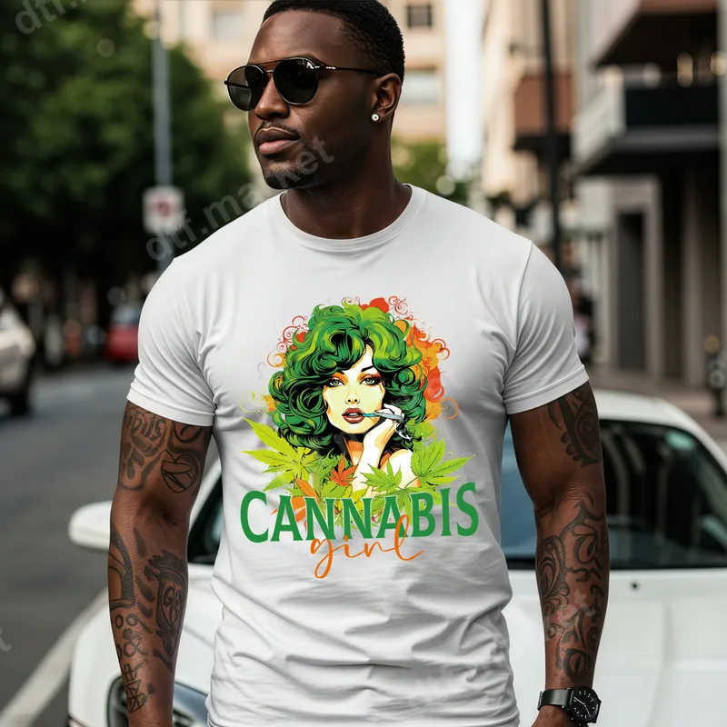See allThis striking DTF transfer features an artistic 'Cannabis Girl' design, radiating vibrant, expressive energy. Her lush green hair, styled like cannabis leaves, frames a captivating face with alluring eyes and full lips, delicately holding a lit joint. Cannabis leaves and bold 'CANNABIS girl' text complete the look against a dynamic splash of green, orange, and red. This ready to press transfer is perfect for making a bold statement. Ideal for cannabis culture enthusiasts, fashion-forward individuals, and anyone looking to express their unique personality, this heat press design is a must-have. It’s perfect for casual wear, music festivals, social gatherings, or as a distinctive gift for friends who appreciate cannabis-inspired art. Use this iron on transfer to create custom apparel that truly stands out. Our premium heat transfer works flawlessly on cotton, polyester, and their blends. For best results, apply with a heat press at 300-325°F for 15 seconds with medium pressure, then warm peel. A household iron can also be used. Enjoy the convenience of a ready to press transfer with no tedious weeding required, making custom projects simple and fun. Crafted using professional-grade DTF film, this apparel transfer ensures exceptionally vibrant colors, sharp details, and a soft, smooth feel once applied. It's designed to be durable, crack-resistant, and machine washable, maintaining its integrity and visual appeal wash after wash. Elevate your garments with this high-quality, long-lasting t-shirt transfer that truly pops.