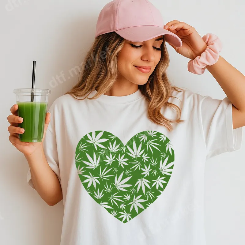 See allThis eye-catching DTF transfer features a vibrant green heart filled with intricately detailed white cannabis leaves, creating a bold and expressive statement design. It's a perfect ready to press graphic for anyone who loves unique, personality-driven apparel or wants to subtly showcase their appreciation for plant culture. Ideal for cannabis enthusiasts, 420 culture supporters, and anyone looking to express their identity with a distinctive graphic. This design makes a thoughtful and unique gift for friends, family, or yourself, perfect for casual outings, music festivals, or simply making a statement everyday. Embrace your passion and customize your wardrobe effortlessly. Applying this premium heat press ready transfer is incredibly straightforward, whether you're using a professional heat press or a household iron. Our high-quality iron on transfers adhere beautifully to a wide range of fabrics, including cotton, polyester, and various blends. For optimal results with a heat press, apply at 300-325°F for 15 seconds with medium pressure, then cold peel for a flawless finish. The best part? No tedious weeding is required, saving you significant time and effort compared to traditional methods. Experience professional-grade quality with every application of this heat press transfer. Our DTF (Direct-to-Film) technology ensures incredibly vibrant colors that pop, are highly crack-resistant, and boast a remarkably soft, smooth feel on any garment. This durable t-shirt transfer is crafted using professional DTF film with a strong adhesive, ensuring your custom apparel transfer lasts wash after wash, maintaining its vivid look and integrity.